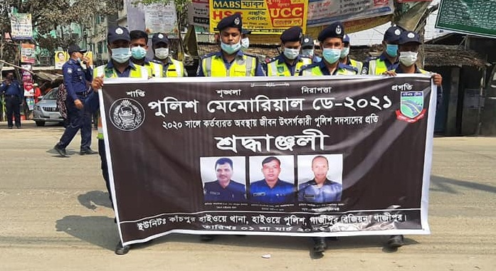সোমবার সকালে কাঁচপুর হাইওয়ে থানা পুলিশ ঢাকা-চট্টগ্রাম মহাসড়কে র্যালী ও ফুল দিয়ে ২০২০ সালের মহামারি করোনা ভাইরাসে আক্রান্ত হয়ে শহীদ পুলিশ সদস্যসহ সকল পুলিশদের প্রতি শ্রদ্ধাঞ্জলী জানান তারা।