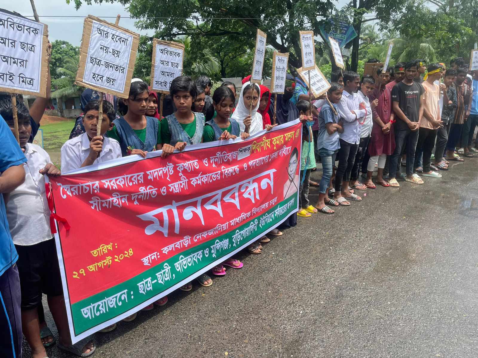 (২৭ আগস্ট) মঙ্গলবার সকাল ১১ টায় উপজেলার বুড়িগোয়ালিনি ইউনিয়নের কলবাড়ি নেকজানীয়া মাধ্যমিক বিদ্যালয়ের সামনে বিক্ষোভ সমাবেশ ও মানববন্ধন করে ছাত্র-ছাত্রীরা।