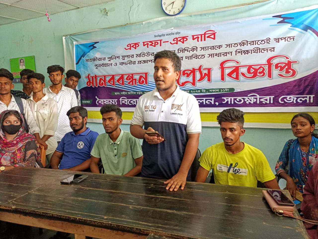 সমন্নয়করা তাদের লিখিত বক্তব্যে আরও বলেন, আন্দোলনের সময়ে সাতক্ষীরার সকল আহতদেরকে এসপি নিজেই তাদের চিকিৎসার খরচ বহন করেছেন।এবং তিনি নিজে ছাত্রদের আন্দোলনে সহযোগিতা করেছেন।আমাদের আন্দোলনকে সফল করার জন্য মাইক থেকে শুরু করে সমস্ত প্রকার সহায়তা দিয়েছন।সুতরাং আমরা সাধারণ শিক্ষার্থীরা সাতক্ষীরার পুলিশ সুপার মো. মতিউর রহমান সিদ্দিকীকে কোনভানে অন্যত্র বদলি করতে দেব না।আমরা বর্তমান এমপিকে স্বপদে বহাল রাখার জন্য উপদেষ্টা পরিষদের কাছে জোর দাবী জানাচ্ছি। তা না হলে আগামীকাল থেকে জোরদার আন্দোলন করবো সাধারণ শিক্ষার্থীরা বলে তারা হুশিয়ারি বক্তব্য প্রদান করেন সংবাদ সম্মেলনে উপস্থিত সমন্নয়কেরা।