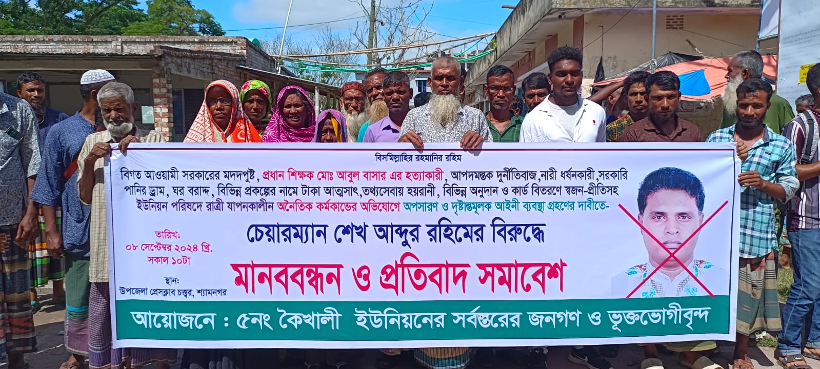 সাতক্ষীরার শ্যামনগর উপজেলা ৫নং কৈখালী ইউনিয়নের চেয়ারম্যান শেখ আব্দুর রহিমের বিরুদ্ধে দুর্নীতি ও অনৈতিক কর্মকাণ্ডের অভিযোগে ইউনিয়নের সর্বস্তরের জনগণ ও ভূক্তভোগীরা আজ উপজেলা প্রেসক্লাব চত্ত্বরে এক মানববন্ধন ও প্রতিবাদ সমাবেশের আয়োজন করে।