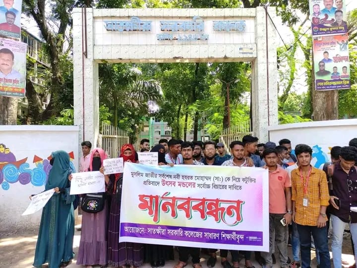 খুলনায় মহানবী হযরত মুহাম্মদ(সা:) সম্পর্কে কট‚ক্তিকারী উৎসব মন্ডলের দৃষ্টান্তমূলক বিচারের দাবিতে র্যালী ও মানববন্ধন কর্মসূচী পালন করেছে সাতক্ষীরা সরকারি কলেজের সাধারন শিক্ষার্থীবৃন্দ। রোববার(৮ সেপ্টেম্বর) সকালে সরকারি কলেজ প্রাঙ্গনে এই আয়োজন করা হয়।মানববন্ধনে বক্তারা বলেন, অসাম্প্রদায়িক বাংলাদেশে কোন ধর্মকে নিয়ে কট‚ক্তি সহ্য করা হবে। খুলনায় উৎসব মন্ডল নামের এক যুবক মহানবী হযরত মুহাম্মদ(সা:) সম্পর্কে ফেসবুকে কট‚ক্তি ও বাজে মন্তব্য করেছিলো। তাকে ধরে আইনের আওতায় এনে দৃষ্টান্তমূলক শাস্তি দিতে হবে।মানববন্ধনে সাধারন শিক্ষার্থীদের মধ্য থেকে বক্তব্য রাখেন রিয়াজ রহমান, সাদিক ইবনে মুজিব, ফয়জুর রহমান, মো: নূরে আলম, মুজাহিদ হোসেন লোহান, মো: সাব্বির হোসেন, হাসিবুল আলম প্রমুখ।