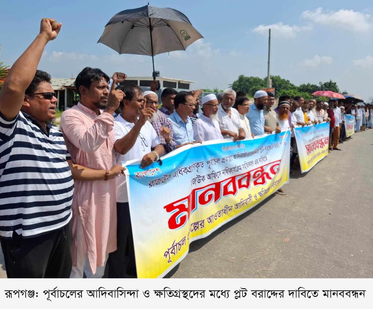 রাজউকের পূর্বাচল উপশহরের শেখ হাসিনা ও তাঁর পরিবারের নামে বরাদ্দকৃত প্লট বাতিল ও বঞ্চিত আদিবাসিন্দাদের মধ্যে প্লট বরাদ্দের দাবিতে মানববন্ধন করা হয়েছে। ৯দফা দাবিতে গতকাল ২০সেপ্টেম্বর শুক্রবার পূর্বাচলের ৩শ’ ফুট সড়কের জলসিঁড়ি বাসস্ট্যান্ড এলাকায় প্লট বঞ্চিত আদিবাসিন্দারা প্রখর রোদ উপেক্ষা করে এ কর্মসূচিতে অংশ নেয়। জলসিঁড়ি বাসস্ট্যান্ড গোলচত্বরে আয়োজিত মানববন্ধন পূর্বক সভায় সভাপতিত্ব করেন পূর্বাচলের আদিবাসিন্দা ও রূপগঞ্জ উপজেলা বিএনপির সভাপতি এডভোকেট মাহফুজুর রহমান হুমায়ুন।