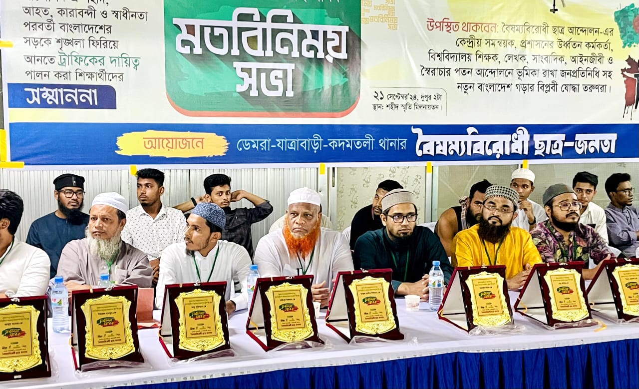 আজ ২১ সেপ্টেম্বর'২৪ দুপুর ২টায় ঢাকা দক্ষিণ সিটি করপোরেশনের ৬৭ নং ওয়ার্ড কাউন্সিলর কার্যালয় সংলগ্ন ডেমরা সারুলিয়ায় শহীদ স্মৃতি মিলনায়তনে শেখ মুহাম্মাদ মাহবুবুর রহমানের সঞ্চালনায় বৈষম্যবিরোধী ছাত্র আন্দোলন-এ শহীদ, আহত, কারাবন্দী ও স্বাধীনতা পরবর্তী বাংলাদেশের সড়কে শৃঙ্খলা ফিরিয়ে আনতে ট্রাফিকের দায়িত্ব পালন করা শিক্ষার্থীদের সম্মাননা ও কেমন বাংলাদেশ চাই শীর্ষক মতবিনিময় সভা অনুষ্ঠিত হয়।