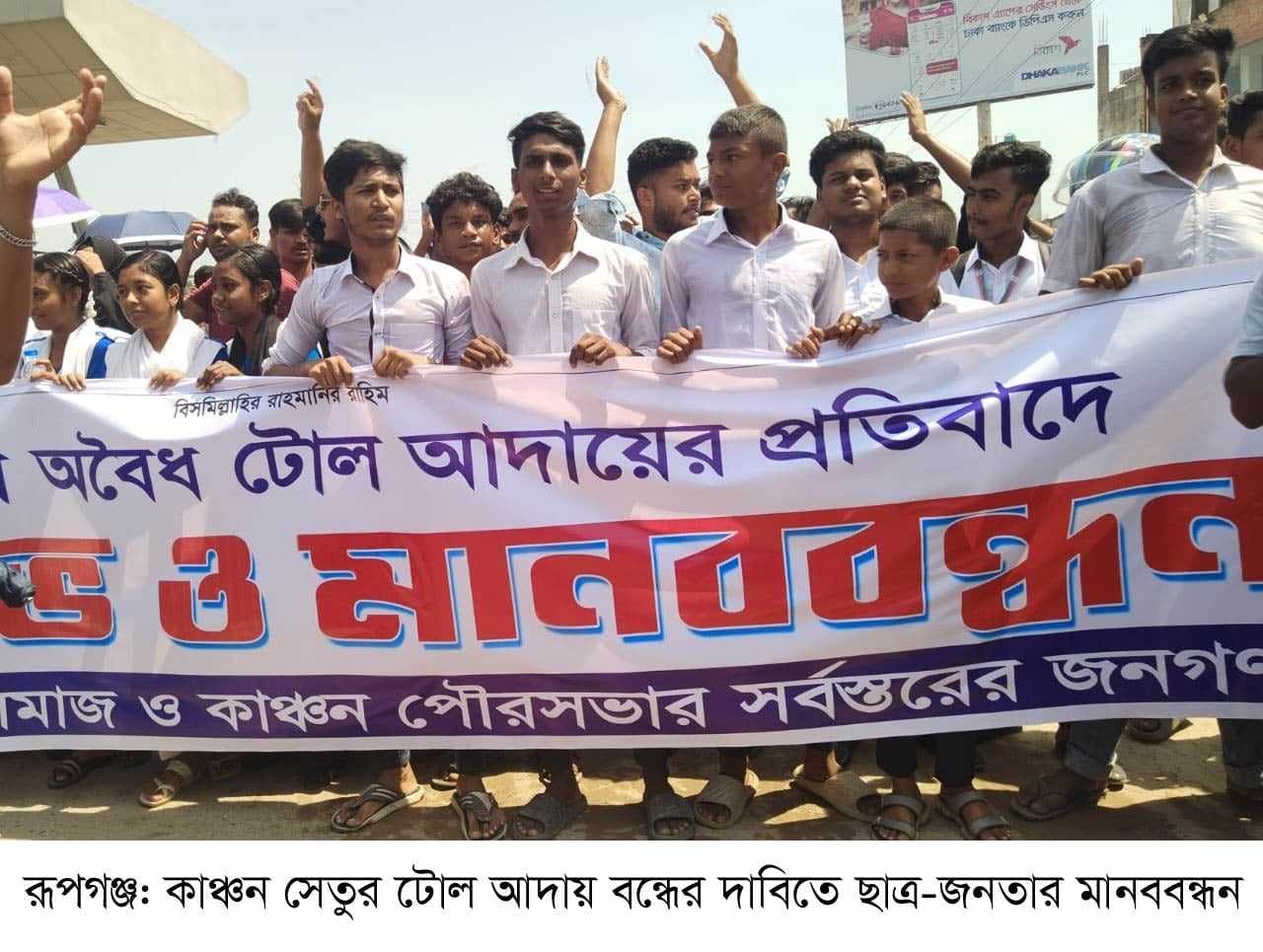 জানযট নিরসনে রূপগঞ্জের কাঞ্চন সেতুর টোল আদায় বন্ধের দাবীতে গতকাল ২২সেপ্টেম্বর রবিবার টোলপ্লাজার সামনে সড়ক অবরোধ করে ছাত্র-জনতা মানববন্ধন ও বিক্ষোভ কর্মসূচি পালন করে। এময় সড়কের উভয়দিকে কয়েক কিলোমিটার দীর্ঘ যানজটের সৃষ্টি হয়। মানববন্ধনে স্থানীয় বিভিন্ন শিক্ষা প্রতিষ্ঠানের শিক্ষার্থী ও সাধারণ জনগণ অংশ গ্রহণ করেন। মানববন্ধন পূর্বক সভায় বক্তব্য রাখেন কাঞ্চন পৌরসভার কাউন্সিলর মফিকুল ইসলাম, কাঞ্চন পৌরসভা বিএনপির সাংগঠনিক সম্পাদক কোহিনূর আলম, ছাত্র দলের হৃদয়, জিতু আহম্মেদ, রাকিব হাসান প্রমুখ।