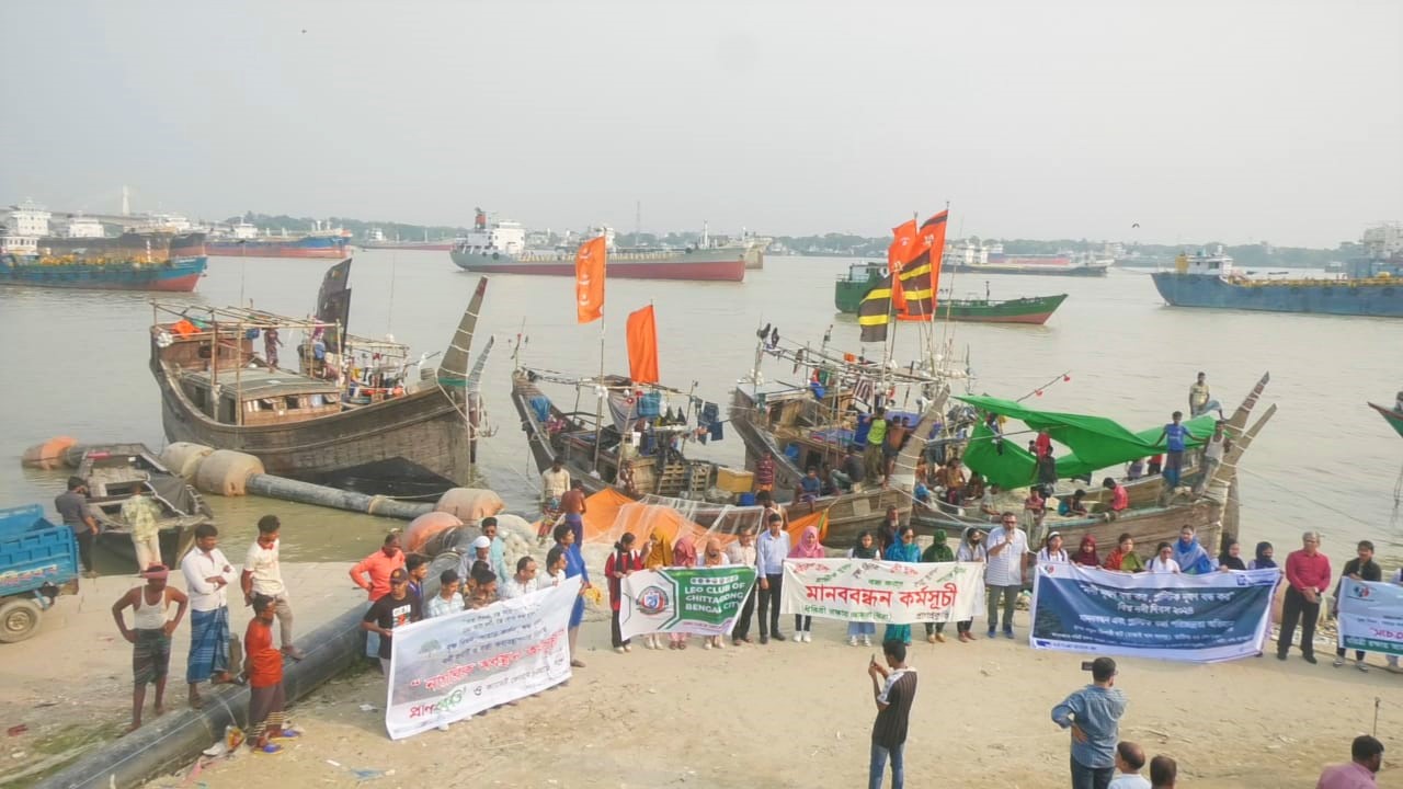 বিশ্ব নদী দিবস উপলক্ষে ওয়াটারকিপার্স বাংলাদেশ ধরিত্রী রক্ষায় আমরা (ধরা) চট্টগ্রাম, ব্লু প্ল্যানেট ইনিশিয়েটিভ, মাসিক প্রাণপ্রকৃতির আয়োজনে চট্টগ্রামের প্রাণ কর্ণফুলী নদীর তীরে নতুন ফিশারি ঘাট এলাকায় একটি মানববন্ধন এবং প্লাস্টিক বর্জ্য পরিচ্ছন্নতা অভিযান ২২ সেপ্টেম্বর ২০২৪ রবিবার পরিচালিত হয়। ধরা চট্টগ্রামের সাধারণ সম্পাদক বিশিষ্ট কবি, লেখক, ও মাসিক প্রাণপ্রকৃতি সম্পাদক শারুদ নিজামের সঞ্চালনায় ও লায়ন্স ইন্টারন্যাশনাল এর জেলা ৩১৫-বি৪ এর লায়ন্স জেলা গর্ভনর লায়ন কোহিনূর কামাল এমজেএফ’র সভাপতিত্বে অনুষ্ঠানের শুরুতে বক্তব্য রাখেন পরিবেশ কর্মী সৈয়দ আহমেদ বাদল। তিনি কর্ণফুলী নদী রক্ষায় নাগরিকদের আরো যত্নশীল হবার আহবান করেন। পরিবেশকর্মী আনিসুর রহমান বাবুল বলেন, নদীমাতৃক এই দেশে নদী হচ্ছে আমাদের জাতীয় সম্পদ। এই সম্পদ রক্ষায় সর্বস্তরের জনগণের এগিয়ে আসা উচিত। পরিবেশ সংগঠক লায়ন ওবায়দুর রহমান বলেন কর্ণফুলীর নাব্যতা হারানোর কথা উঠে আসে। তিনি চট্টগ্রামের সুয়ারেজ সিস্টেমের সমালোচনা করে বলেন, এই রূপ ড্রেনেজ সিস্টেম চালু থাকলে কর্ণফুলীর দূষণ রোধ সম্ভব নয়, বরং একসময় ঐতিহ্যবাহী এই নদী কালের বিবর্তনে হারিয়ে যাবে। একজন সচেতন নাগরিক হিসেবে ডাক্তার ইফতেখার এই কর্মসূচিতে অংশ নিয়ে বলেন, নদী দূষণ রোধে আমাদের সচেতন নাগরিকদের সবার আগে এগিয়ে আসা উচিত। নদী রক্ষায় বিভিন্ন ময়লা আবর্জনা খালে নদীতে না ফেলার অনুরোধ জানান। পরিবেশ সংগঠক এ্যাড: রেহানা বেগম রানু বলেন, নদী রক্ষায় মনের আবর্জনা আগে পরিষ্কার করা উচিত। তিনি আরো বলেন, বড় বড় শিল্প প্রতিষ্ঠানের বর্জ্য ফেলার কারনে নদী দখল এবং দূষণ এর জন্য সবচেয়ে দায়ী। তবে কেন তাদের থেকে দখলমুক্ত করে, তাদের থেকে ক্ষতিপূরণ নিয়ে তাদেরকে কেন আইনের আওতায় আনা হবেনা? ধরার অন্যতম সংগঠক ইমাম হোসেন চৌধুরী বলেন, আজকের কর্মসূচি শুধু ব্যানার নিয়ে দাঁড়ানো নয় একটা ফলাফল নিয়ে আসাই হোক আমাদের প্রত্যয়। চট্টগ্রাম বিশ্ববিদ্যালয় ভূগোল বিভাগের প্রফেসর ইকবাল সারোয়ার প্লাস্টিক এবং মাইক্রোপ্লাস্টিক ব্যবহার বিষয়ে একদম জিরো টলারেন্স কার্যকরের অনুরোধ জানান। মুক্তিযোদ্ধা প্রফেসর ইদ্রিস আলী বলেন, বাংলাদেশের প্রাণ কর্ণফুলী বাঁচলে বাংলাদেশ বাঁচবে। তাই আমাদের প্রত্যেককে এই অর্থকরী নদী রক্ষায় এগিয়ে আসতে হবে।