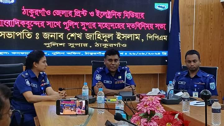 নবাগত ঠাকুরগাঁও জেলা পুলিশ সুপার শেখ জাহিদুল ইসলামের সাথে সাংবাদিকদের মতবিনিময় সভা অনুষ্ঠিত হয়েছে। ২৬ সেপ্টেম্বর বৃহস্পতিবার বিকাল ৫ টায় ঠাকুরগাঁও পুলিশ সুপার কার্যালয়ের সম্মেলন কক্ষে এ সভা অনুষ্ঠিত হয়। নবাগত ঠাকুরগাঁও জেলা পুলিশ সুপার শেখ জাহিদুল ইসলামের সভাপতিত্বে মতবিনিময় সভায় উপস্থিত ছিলেন ঠাকুরগাঁও অতিরিক্ত পুলিশ সুপার মোছা. লিজা বেগম, ঠাকুরগাঁও সদর সার্কেলের অতিরিক্ত পুলিশ সুপার মিথুন সরকার, ঠাকুরগাঁও সদর থানার নবাগত ভারপ্রাপ্ত কর্মকর্তা (ওসি) তাজুল ইসলাম, ঠাকুরগাঁও প্রেসক্লাবের ভারপ্রাপ্ত সভাপতি মো. লুৎফর রহমান