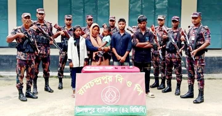 দিনাজপুরের বিরলে অবৈধ ভাবে ভারতে পালানোর সময় সীমান্ত থেকে ০২ জন পুরুষ, ১ জন নারী ও ২ জন শিশুকে আটক করেছে বর্ডার গার্ড বাংলাদেশ (বিজিবি)। রবিবার মধ্যরাত ১২: ৪৫ টার দিকে বিরল উপজেলার ৬ নং ভান্ডারা ইউনিয়নের রামচন্দ্রপুর বিওপি’র ৩২৯ এর ৭ এস পিলার সংলগ্ন মৌচুষা (দীপাপাড়া) এলাকা থেকে তাদের আটক করে। আটককৃতরা হলেন, (০১) শ্রী পঞ্চানন রায় (৩৩) পিতা- শ্রী প্রভাস চন্দ্র রায়, গ্রাম- টঙ্গুয়া থানা খানসামা, জেলা- দিনাজপুর। (০২)তাপসী রানী রায় (৩০) স্বামী- পঞ্চানন রায়, গ্রাম- টঙ্গুয়া থানা খানসামা, জেলা- দিনাজপুর। (০৩)তপু রায় (২০) পিতা- পরেশ চন্দ্র, গ্রাম- সুজালপুর, থানা- বীরগঞ্জ জেলা দিনাজপুর।। (০৪) পাওলিনা হেমরম (১৩) পিতা- হরেন হেমরম, গ্রাম- বিন্দাবনপুর গোদাগাড়ী রাজশাহী (০৫)দিপ্ত চন্দ্র রায় (০৩) পিতা- পঞ্চানন রায়, মাতা- তাপসী রানী রায় টঙ্গুয়া থানা খানসামা, জেলা- দিনাজপুর।জানা যায়, আটককৃতরা দালাল চক্রের মাধ্যমে রাতের অন্ধকারে অবৈধ ভাবে রামচন্দ্রপুর বিওপি’র মৌচুষা (দিপাপাড়া) ৩২৯ এর ৮ এস পিলার সংলগ্ন এলাকার সীমান্ত দিয়ে ভারতে প্রবেশের জন্য এসেছিলেন। খবর পেয়ে রামচন্দ্রপুর বিওপির নায়েক বদিউজ্জামান এর নেতৃত্বে অভিযান চালিয়ে তাদেরকে আটক করে। রামচন্দ্রপুর বিওপির নায়েক বদিউজ্জামান জানান, বিরল উপজেলার ৬ নং ভান্ডারা ইউনিয়নের রামচন্দ্র বিওপির আওতাধীন বিরল উপজেলাস্থ ভান্ডারা ইউনিয়নের বিওপি’র মৌচুষা (দিপাপাড়া) বাংলাদেশ হতে ভারতে অবৈধভাবে সীমান্ত ৩২৯ এর ৮ এস পিলার সংলগ্ন এলাকার সীমান্ত পারাপারের সময় রাজশাহী ও দিনাজপুর জেলার বিভিন্ন বয়সী ০৫ জনকে আটক করে। আটককৃতদের দিনাজপুর জেলার বিরল থানায় হস্থান্তর করা হয়েছে।