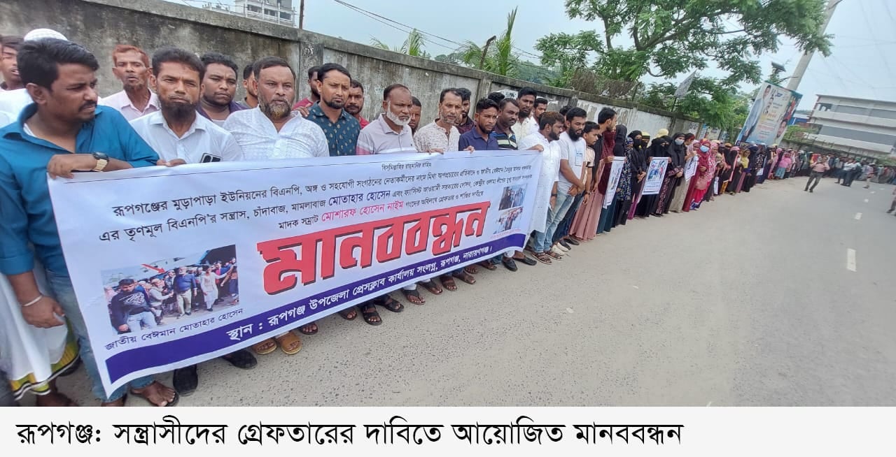 নারায়ণগঞ্জের রূপগঞ্জ উপজেলা বিএনপি নেতাকর্মীদের বিরুদ্ধে অপপ্রচার ও সন্ত্রাসীদের গ্রেফতারের দাবিতে মানববন্ধন করা হয়েছে। গতকাল ৩০সেপ্টেম্বর সোমবার মুড়াপাড়া ইউনিয়নের মঠেরঘাট এলাকায় এ কর্মসূচি পালন করা হয়। মানববন্ধন পূর্বক আয়োজিত সভায় সভাপতিত্ব করেন মুড়াপাড়া ইউনিয়ন বিএনপির সহ-সাংগঠনিক সম্পাদক মোঃ কামাল হোসেন।