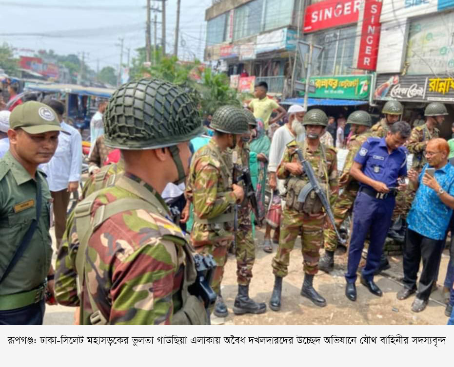 ঢাকা-সিলেট মহাসড়কের নারায়ণগঞ্জ জেলার রূপগঞ্জের ভুলতা গাউছিয়া এলাকায় যৌথ বাহিনীর সদস্যরা অভিযান চালিয়ে পাঁচ শতাধিক অবৈধ দখলদারীকে উচ্ছেদ করেছে।
