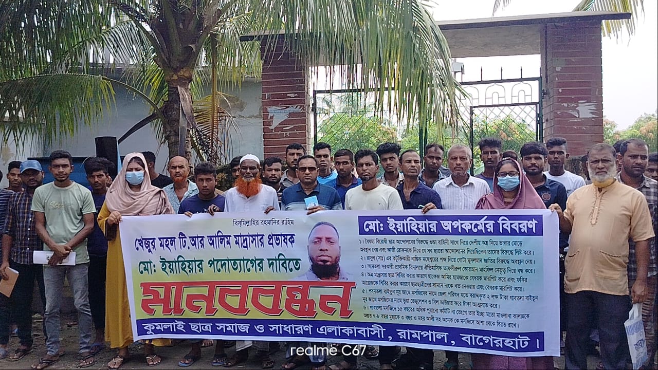 রামপাল(বাগেরহাট)প্রতিনিধিঃ বাগেরহাটের রামপালে খেজুরমহল টি.আর আলিম মাদ্রাসার প্রভাষক মোঃ ইয়াহিয়া’র পদত্যাগের দাবিতে মানববন্ধন কর্মসূচি পালিত হয়েছে।