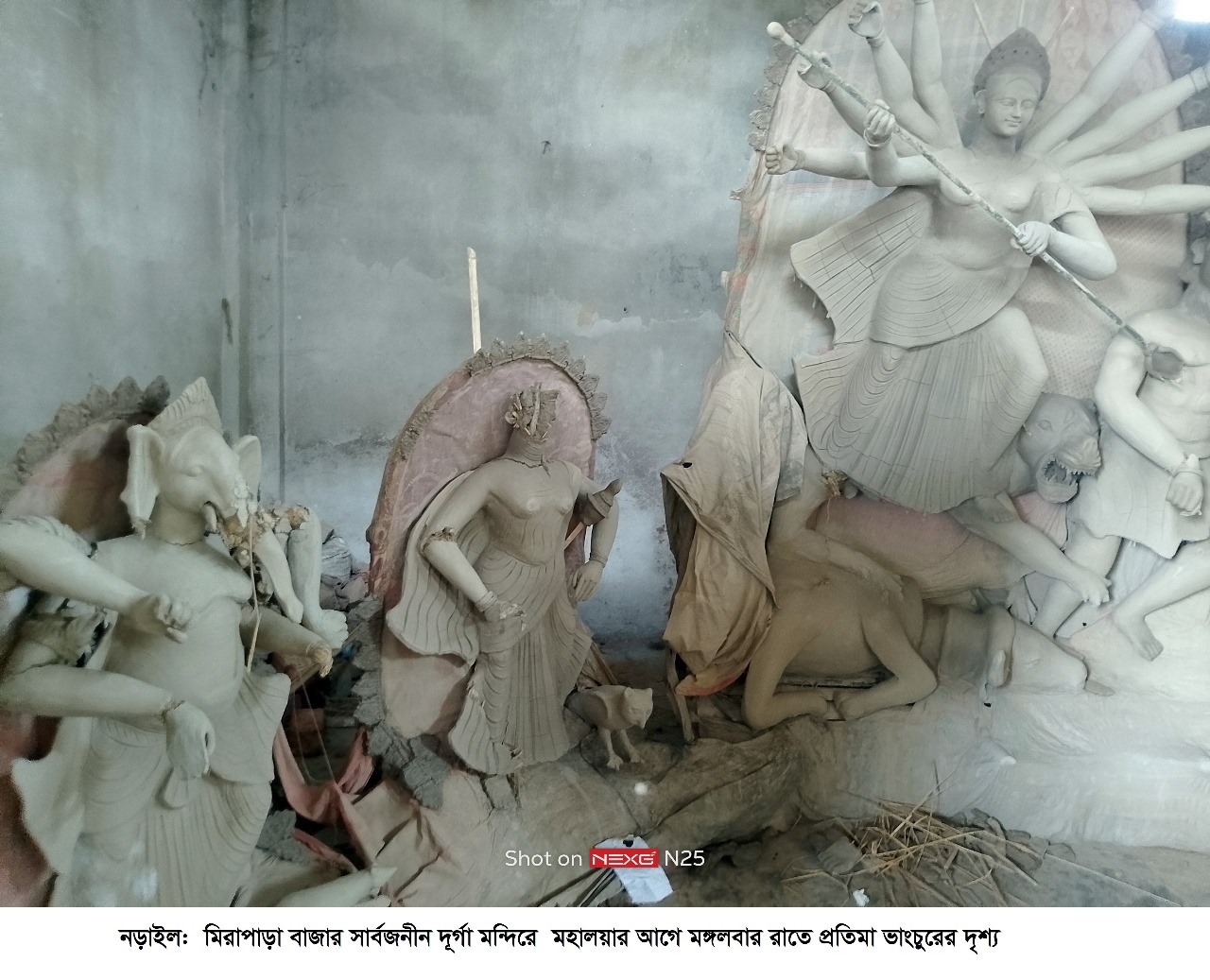 নড়াইলে একটি মন্দিরে হামলা চালিয়ে দুর্গাসহ বেশ কয়েকটি প্রতিমা ভাঙচুর চালিয়েছে দুর্বৃত্তরা। মঙ্গলবার মহালয়ার রাতে সদর উপজেলার ভদ্রবিলা ইউনিয়নের মিরাপাড়া বাজারে সার্বজনীন দূর্গা মন্দিরে এই প্রতিমা ভাঙচুরের ঘটনা ঘটে। এ ঘটনায় জেলা প্রশাসন,জেলা পুলিশ ও পূজা উদযাপন পরিষদের নেতাকর্মীরা পরিদর্শন করেছেন। উজ্জ্বল রায়, নড়াইল জেলা প্রতিনিধি জানান, এলাকা সূত্রে জানা গেছে,উপজেলার মিরাপাড়া বাজারে সার্বজনীন দূর্গা মন্দিরে মঙ্গলবার মহালয়ার রাতে পূজা উদযাপন কমিটির সদস্যরা মন্দিরে লাইট জ্বালিয়ে যে যার মত চলে যান। পরে সকালে ভাস্কর্যরা প্রতিমায় রং তুলির কাজ করতে আসলে দেখেন প্রতিমা ভাঙচুর করা হয়। পরে মন্দির কমিটির সদস্যদের জানালে তারা বিষয়টি পুলিশকে অবগত করেন।