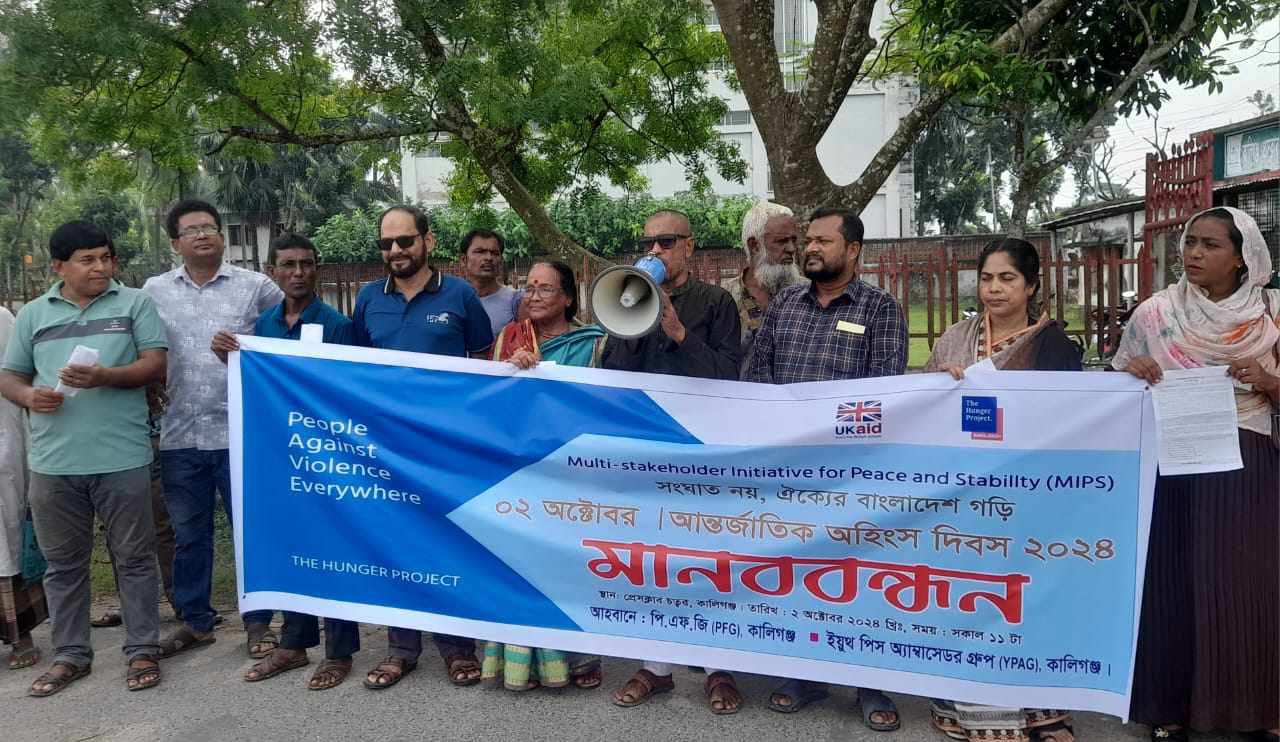 সাতক্ষীরার কালিগঞ্জে মানববন্ধন, র্যালী, ঘোষনাপত্র পাঠ ও আলোচনা সভার মধ্যদিয়ে আন্তর্জাতিক অহিংস দিবস পালিত হয়েছে। "সংঘাত নয়, ঐক্যের বাংলাদেশ গড়ি" এই শ্লোগানে পিএফজি গ্রুপ কালিগঞ্জ উপজেলা শাখার আয়োজনে বুধবার ২ অক্টোবর বেলা ১০ টায় কালিগঞ্জ প্রেসক্লাবের সামনে অনুষ্ঠিত মানববন্ধনে পিএফজি গ্রুপের এ্যাম্বাসেডর ও উপজেলা বিএনপির সদস্য সচিব ডাঃ শেখ শফিকুল ইসলাম বাবুর সভাপতিত্বে প্রধান অতিথির বক্তব্য রাখেন উপজেলা সুজন এর সভাপতি ও পিএফজি গ্রুপের সাবেক এ্যাম্বাসেডর শেখ সাইফুল বারী সফু, বিশেষ অতিথির বক্তব্য রাখেন সুজন এর উপজেলা শাখার সহ সভাপতি শেখ আনোয়ার হোসেন, সুজনের যুগ্ম সাধারণ সম্পাদক ও সাবেক এ্যাম্বাসেডর এম হাফিজুর রহমান শিমুল, সজনের উপজেলা সেক্রেটারী পিএফজি গ্রুপের সমন্বয়কারী সুকুমার দাশ বাচ্ছু'র সঞ্চালনায় উপস্থিত ছিলেন উপজেলা লেডিস ক্লাবের সম্পাদিকা ঈলাদেবী মল্লিক, পিএফজির সদস্য এস এম আহম্মদ উল্ল্যাহ বাচ্ছু, মীর জাহাঙ্গীর হোসেন, বাবলা আহমেদ, লাইলি পারভীন, মিলন কুমার ঘোষ, আলী সোহরাব, শেখ পারভেজ ইসলাম, আলমগীর হোসেন, শেখ আল নুর আহমেদ ঈমন, শেখ আব্দুল্লাহ, আমিরুল ইসলাম, জিএম পারভেজ প্রমুখ। দি হাঙ্গার প্রজেক্টের উদ্যোগে সংঘাত নয়, ঐক্যের বাংলাদেশ গড়ি এই শ্লোগানে ২০১৭ সাল হতে বিভিন্ন কর্মসূচী পালিত হয়ে আসছে। র্যালী ও আলোচনা সভায় অংশগ্রহণ করেণ পিএফজি গ্রুপের উপজেলা কমিটির সদস্যবৃন্দ, শিক্ষক মণ্ডলী, সাংবাদিকবৃন্দ, শিল্পী, কবি, দি হাঙ্গার প্রজেক্টের কর্মকর্তাবৃন্দ, সূধী ও শিক্ষার্থীরা।