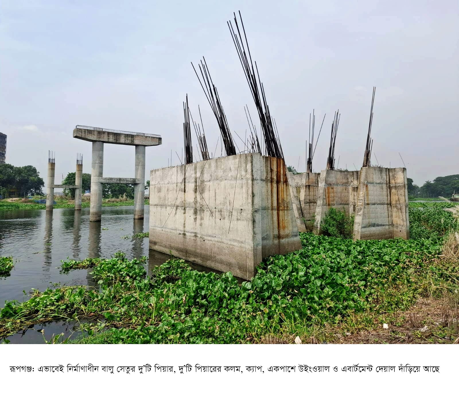 সরেজমিনে গিয়ে দেখা গেছে, বালু নদীর সেতুর দু’টি পিয়ার, দু’টি পিয়ারের কলম, ক্যাপ, একপাশে উইংওয়াল ও এবার্টমেন্ট দেয়াল দাঁড়িয়ে আছে। সেতুর সংযোগ সড়কের বেহাল দশা। ওই সড়কের সলিং করা ইট উঠে গেছে। ব্যবহৃত রড মরিচিকায় ধরেছে।