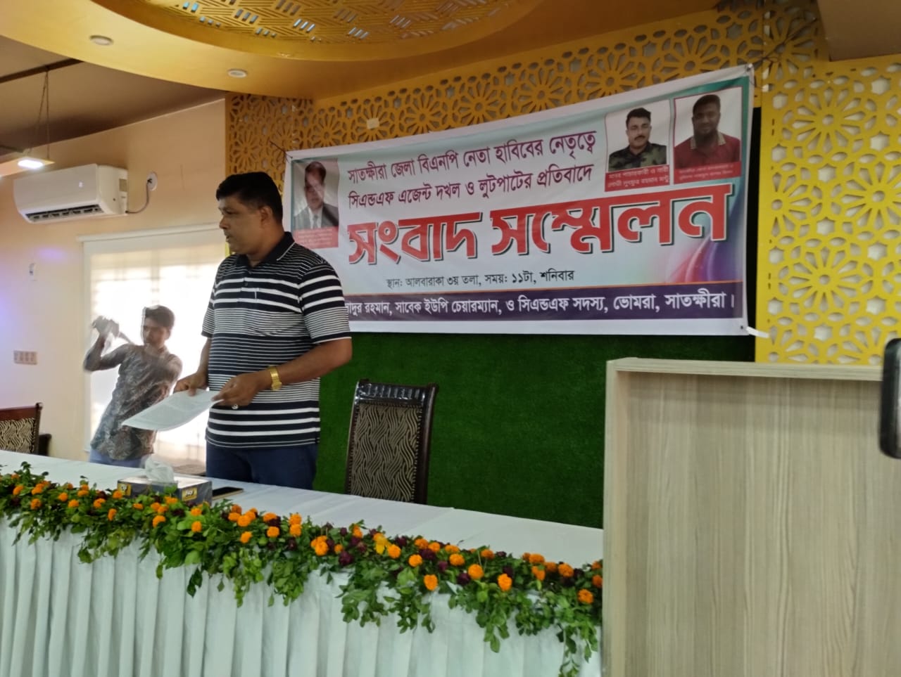 সাতক্ষীরা জেলা বিএনপি'র যুগ্ম আহ্বান ও সমন্বয়ক হাবিবুল রহমানের নেতৃত্বে ভোমরা স্থল বন্দর সি এন্ড এফ এজেন্ট দখল লুটপাট ও ভোটার তালিকায় নাম বাদ দেওয়াসহ নানা অনিয়ম দুর্নীতি প্রতিবাদে সংবাদ সম্মেলন অনুষ্ঠিত হয়েছে। আজ শনিবার দুপুরে শহরর নিউমার্কেট মোড়ে¯ আলবারাকা হোটেলের তৃতীয় তলায় উক্ত সংবাদ সম্মেলনের আয়োজন করেন, সদর উপজেলার ভোমরা ইউনিয়নের চোবাড়িয়া গ্রামের রাহাতুল্লাহ গাইনের পুত্র সাবেক যুবদলের সহ-সভাপতি ও সাবেক ইউপি চেয়ারম্যান ব্যবসায়ী মোঃ আসাদুর রহমান।