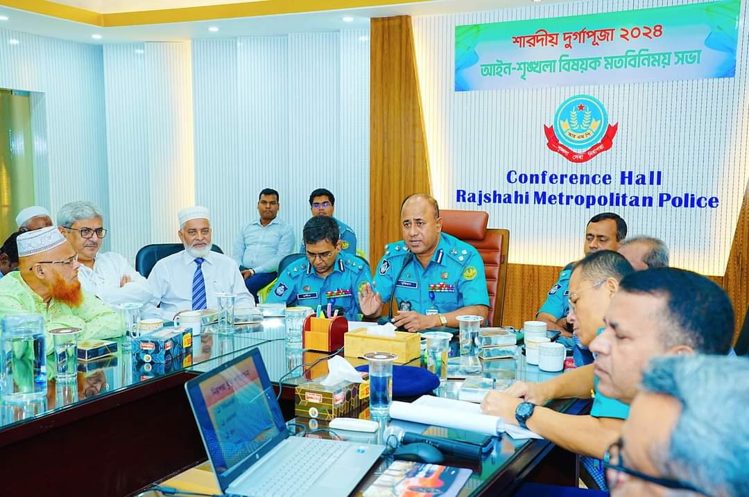 সোমবার ৭ অক্টোবর ২০২৪ সকাল সাড়ে ১১ টায় রাজশাহী মেট্রোপলিটন পুলিশের (আরএমপি) আয়োজনে আরএমপি সদর দপ্তর কনফারেন্স রুমে শারদীয় দুর্গাপূজা উদযাপন উপলক্ষে আইনশৃঙ্খলা বিষয়ক মতবিনিময় সভা অনুষ্ঠিত হয়। সভায় সভাপতিত্ব করেন আরএমপি’র পুলিশ কমিশনার জনাব মোহাম্মদ আবু সুফিয়ান মহোদয়।