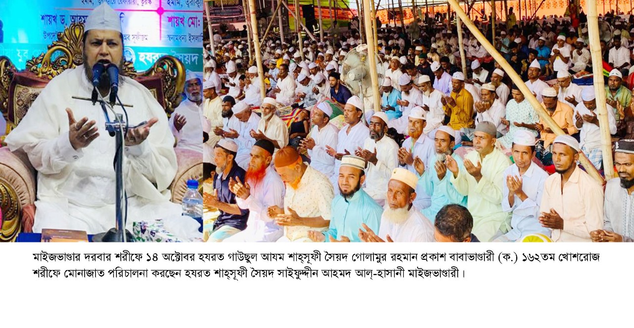 আজ ১৪ অক্টোবর, সোমবার, খোশরোজ শরীফের প্রধান ও সমাপনী দিবসে মাইজভাণ্ডার রহমানিয়া মইনীয়া দরসে নেজামী মাদ্রাসা মাঠে আয়োজিত মাহফিলে বাংলাদেশ সুপ্রিম পার্টির-বিএসপি চেয়ারম্যান হযরত শাহ্সূফী মাওলানা সৈয়দ সাইফুদ্দীন আহমদ আল্-হাসানী (ম.জি.আ.) সভাপতির বক্তব্যে বলেন, মাইজভাণ্ডার দরবার আল্লাহর করুণা ও রহমতের আধ্যাত্মিক প্রাণকেন্দ্র। এখানে এসে কেউ খালি হাতে ফিরে না। গাউছুল আযম হযরত সৈয়দ গোলামুর রহমান বাবাভাণ্ডারী কাদ্দাছাল্লাহু ছিররাহুল আজিজসহ মাইজভাণ্ডারী মহাত্মাগণ সর্বশ্রেণীর মানুষের কল্যাণে আজীবন নিবেদিত ছিলেন। বৈষম্য, বিভেদ, অনৈক্য-বিভাজন ও মানুষে মানুষে হানাহানি-সংঘাতের বিপরিতে আউলিয়া কেরামগণ মানুষকে শান্তি সাম্য ও কল্যাণের কথাই বলেছেন।