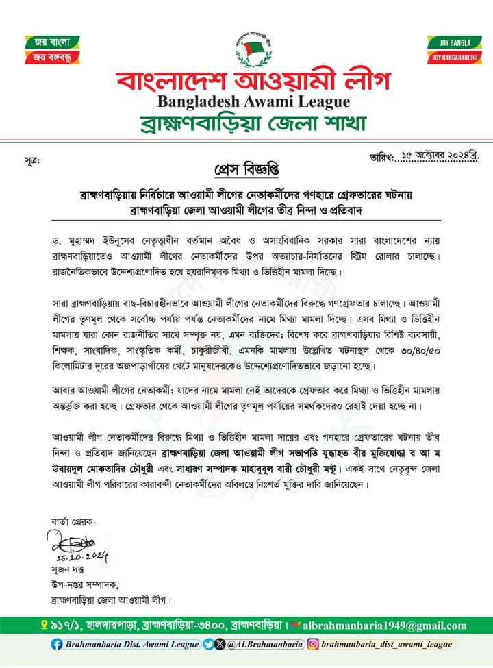 সারা ব্রাহ্মণবাড়িয়ায় বাছ-বিচারহীনভাবে আওয়ামী লীগের নেতাকর্মীদের বিরুদ্ধে গণগ্রেফতার চালাচ্ছে। আওয়ামী লীগের তৃণমূল থেকে সর্বোচ্চ পর্যায় পর্যন্ত নেতাকর্মীদের নামে মিথ্যা মামলা দিচ্ছে। এসব মিথ্যা ও ভিত্তিহীন মামলায় যারা কোন রাজনীতির সাথে সম্পৃক্ত নয়, এমন ব্যক্তিদের; বিশেষ করে ব্রাহ্মণবাড়িয়ার বিশিষ্ট ব্যবসায়ী, শিক্ষক, সাংবাদিক, সাংস্কৃতিক কর্মী, চাকুরীজীবী, এমনকি মামলায় উল্লেখিত ঘটনাস্থল থেকে ৩০/৪০/৫০ কিলোমিটার দূরের অজপাড়াগাঁয়ের খেটে মানুষকেও উদ্দেশ্যেপ্রণোদিতভাবে জড়ানো হচ্ছে।