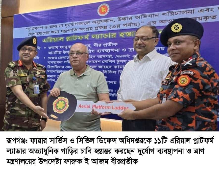 গতকাল ১৯অক্টোবর শনিবার ভ‚মিকম্প ও অন্যান্য দুর্যোগকালে অনুসন্ধান, উদ্ধার অভিযান পরিচালনা এবং জরুরি যোগাযোগের জন্য যন্ত্রপাতি সংগ্রহ প্রকল্প(তৃতীয় পর্যায়) এর আওতায় ক্রয়কৃত এরিয়াল প্লাটফর্ম ল্যাডার হস্তান্তর অনুষ্ঠানে তিনি এসব কথা বলেন।