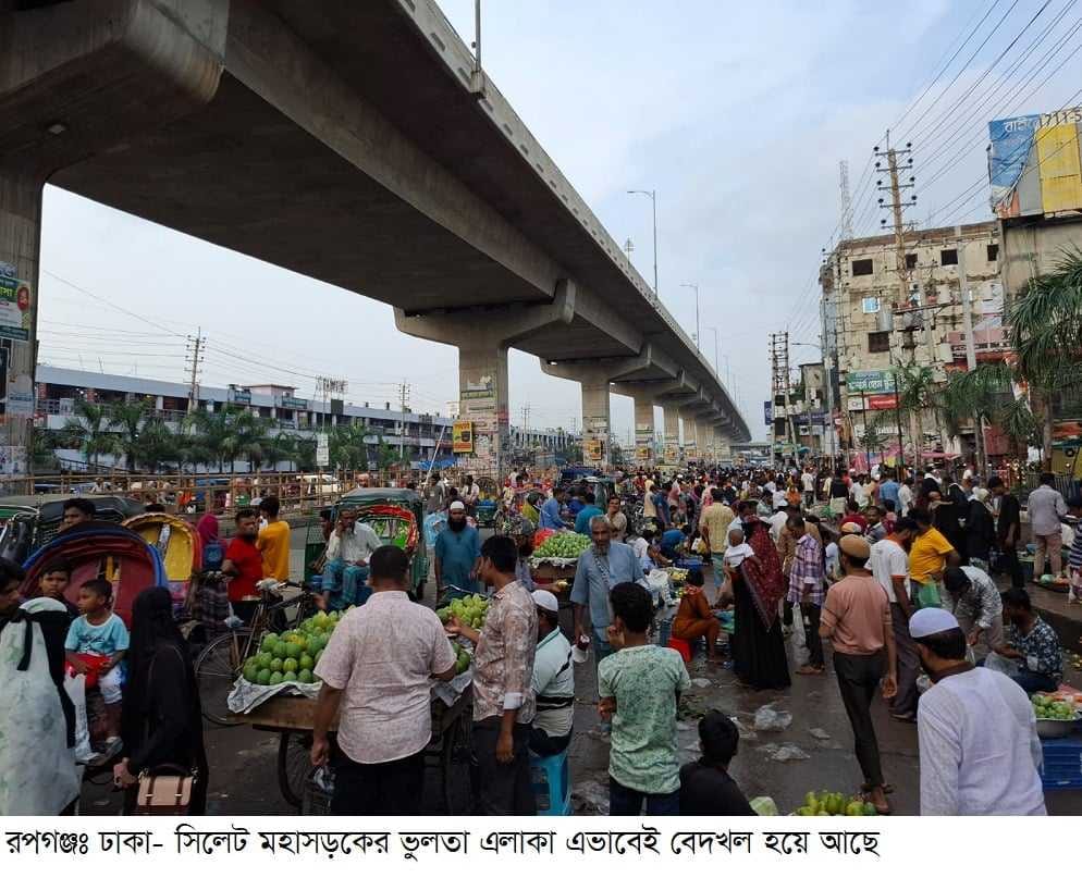 ঢাকা-সিলেট মহাসড়কের নারায়ণগঞ্জের রূপগঞ্জ উপজেলার ভুলতা গাউছিয়া এলাকা উচ্ছেদ অভিযানের একমাস পর ফের হকারদের দখলে চলে গেছে। সড়কের দুইপাশে কাঁচাবাজার, মাছ, তরকারি, কাপড়, জুতা ও ফলের পসরা সাজিয়ে ব্যবসায়ীরা কেনাবেচা করছে। বিভিন্ন ধরণের পণ্য কেউ কেউ ভ্যানগাড়ি করে বিক্রি করছে। এ কারণে যান চলাচলের জন্য জায়গা থাকে খুবই কম। তাতে যানজট পোহাতে হয় দূরপাল্লার যানবাহনকে। হাইওয়ে পুলিশের নজরদারীর অভাবে এ অবস্থার সৃষ্টি হচ্ছে।