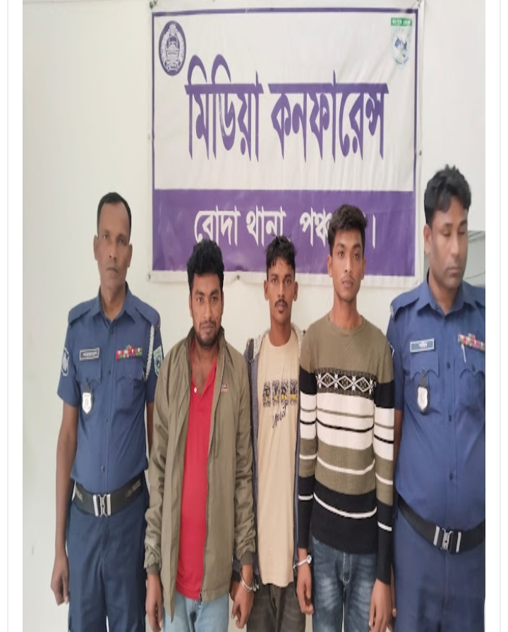 গ্রেফতারকৃতরা হলেন জেলা বোদা উপজেলার সাকোয়া ইউনিয়নের রামপ্রসাদ কার্জীপাড়া গ্রামের মকবুলের ছেলে আজগর আলী (৩৮), শিকারপুর কার্জীপাড়া গ্রামের দেলোয়ার হোসেনের ছেলে মিরাজ হাসান মেহেদী (১৯) ও চন্দনবাড়ী ইউনিয়নের বানিয়াপাড়া গ্রামের আনারুল ইসলামের ছেলে আপেল ইসলাম (২৪) বোদা থানা