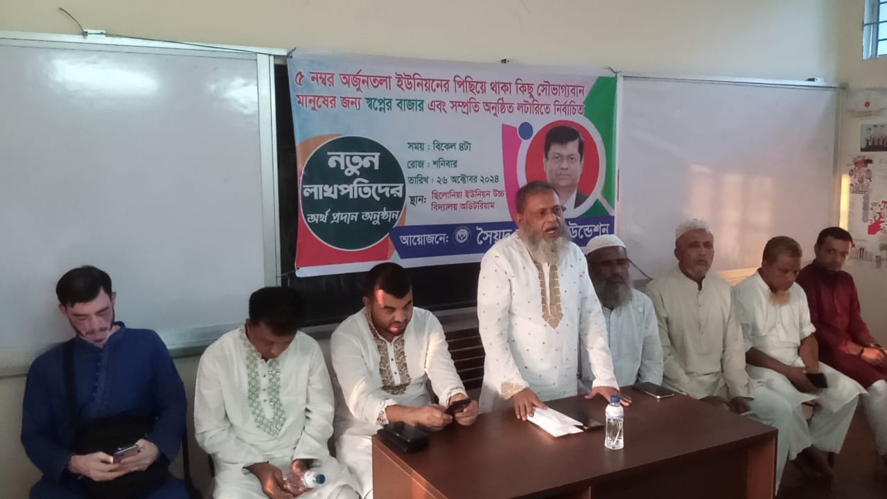 এসময় সৈয়দ হারুন ফাউন্ডেশন এর উপদেষ্টা ও সদস্যরা ৫নং অর্জুনতলা ইউনিয়নের পিছিয়ে থাকা ৪জন সৌভাগ্যবান মানুষের জন্য স্বপ্নের বাজার এবং সম্প্রতি অনুষ্ঠিত লটারিতে নির্বাচিত নতুন ২জন লাখপতিদের মাঝে নগদ ১লক্ষ টাকা করে অর্থ প্রদান করেন।