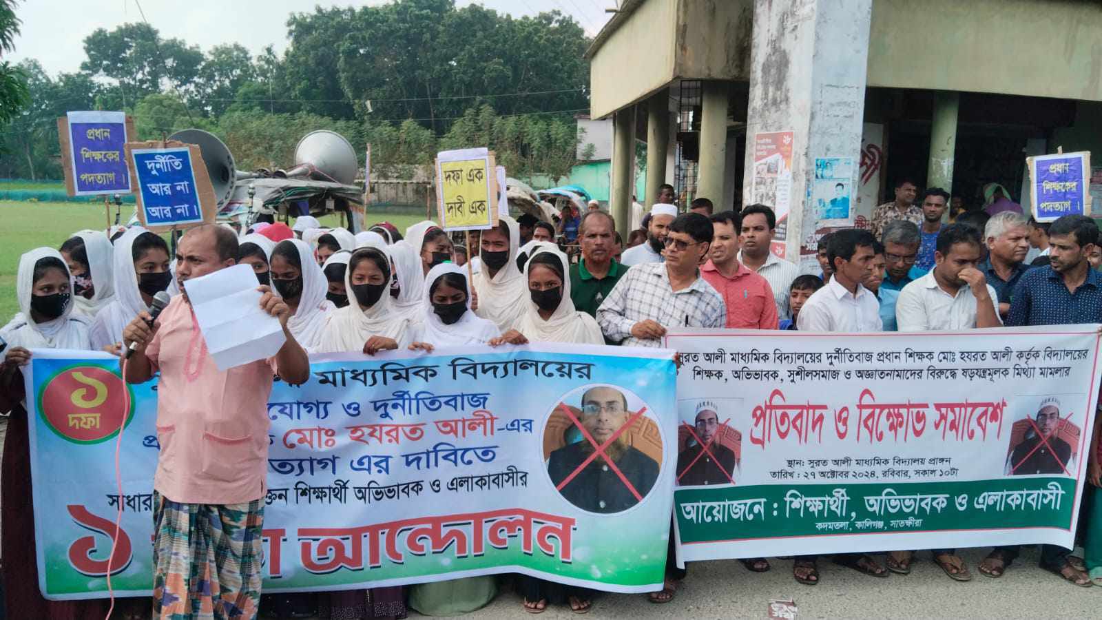 সাতক্ষীরার কালিগঞ্জে সুরত আলী বহুমুখী মাধ্যমিক বিদ্যালয়ের প্রধান শিক্ষকের পদত্যাগ, মিথ্যা মামলা প্রত্যাহারসহ বিবিধ দাবিতে মানববন্ধন ও বিক্ষোভ সমাবেশ অনুষ্ঠিত হয়েছে। বিদ্যালয়ের শিক্ষক, শিক্ষার্থী, প্রাক্তন শিক্ষার্থী অভিভাবক ও ভুক্তভোগীদের অংশগ্রহণে রবিবার (২৭ অক্টোবর)সকাল সাড়ে ১০টায় উপজেলার রতনপুর ইউনিয়নের কদমতলা বাজারে ঘন্টা ব্যাপী মানববন্ধন কর্মসূচি পালন করা হয়। ঐ স্কুলের সহকারী প্রধান শিক্ষক ফজলুর রহমানের সভাপতিত্বে বিক্ষোভ সমাবেশে বক্তব্য রাখেন সহকারী শিক্ষক শহিদুল ইসলাম মুকুল, সহকারী শিক্ষক মোশাররফ হোসেন, অভিভাবক আজাদুর রহমান ও বৈষম্য বিরোধী ছাত্র আন্দোলনে রতনপুর শাখার সমন্বয়ক জাকারিয়া হোসেন, সহ সমন্বয়ক আব্দুল কাদের, সমন্বয়ক ইমরান হোসেন প্রমুখ। এ বক্তারা বলেন বিদ্যালয়ের দূর্নীতিবাজ প্রধান শিক্ষকের পদত্যাগ ও মিথ্যা মামলা হতে অব্যহতি দিতেই হবে। এই বিতর্কিত প্রধান শিক্ষক ও তার মুল দোসর সুজন মেম্বরের বিরুদ্ধে আইনানুগ ব্যবস্থা নিতে পুলিশ ও প্রশাসনের হস্তক্ষেপ দাবী করে তারা আরও বলেন সুজন মেম্বর শেখ হাসিনার সরকারের আমলে জামায়াত শিবির ও বিএনপির নেতা কর্মীদের বিরুদ্ধে বিভিন্ন মামলা প্রদান, পুলিশ দিয়ে হয়রানিসহ অন্যায় ভাবে স্কুলের ছাত্র সেচ্ছাসেবক জাকারিয়ার বিরুদ্ধে মামলা দিয়ে পবিত্র রমজান মাসে জেলে প্রেরণকারী, কদমতলার অপরাধ জগতের গডফাদার। প্রাক্তন মেম্বর সুজনের বিরুদ্ধে সোচ্চার আওয়াজ তুলতে সবার প্রতি আহবান জানানো হয়। দল মত নির্বিশেষে সবাই ছাত্রদের পাশে দাঁড়িয়ে বিদ্যালয়ের রক্ষা করুন আমাদের সন্তানদের সুন্দর ভবিষ্যৎ নিশ্চিত করার জন্য বলেন। সাধারণ শিক্ষার্থীরা বলেন" সুরত আলী বহুমুখী মাধ্যমিক বিদ্যালয়ের অযোগ্য ও দুর্নীতিবাজ প্রধান শিক্ষক মোঃ হযরত আলী স্কুলের ছাত্র-ছাত্রীদের থেকে বিভিন্ন কৌশলে মোটা অংকের টাকা আত্মসাৎ করেন। স্কুলের গাছ কেটে লক্ষ টাকা হাতিয়ে নিয়েছে। সেশন ফি, প্রশ্ন ফি, ফরম ফিল আপের টাকাসহ স্কুলের সরকারের বরাদ্দকৃত টাকা আত্মসাৎ করেছে এবং শিক্ষার মান বজায় রাখতে আমাদের সন্তানের ভবিষত বিনির্মানে প্রধান শিক্ষক হযরত আলির পদত্যাগের একদফা দাবীতে সুশীল সমাজ, এলাকাবাসী, অভিভাবক বৃন্দ, বর্তমান ও প্রাক্তন শিক্ষার্থীবৃন্দ একত্রিত হয়েছি অবলম্ব্বে এই প্রধান শিক্ষকের পদত্যাগের দাবি জানাচ্ছি। প্রখর রৌদ্রময় আবহাওয়া উপেক্ষা করে আন্দোলনে শতশত শিক্ষার্থী ও এলাকাবাসী অংশগ্রহণ করেণ। উল্লেখ্য যে, সম্প্রতি প্রধান শিক্ষককে রাঞ্চিতের অভিযোগে কালিগঞ্জ থানায় আজাদুর রহমানসহ ৬জনের বিরুদ্ধে মামলা দায়ের করেছেন প্রধান শিক্ষক হযরত আলী বাদী হয়ে। এঘটনায় ফুঁসে ওঠে স্কুলের শিক্ষক, কর্