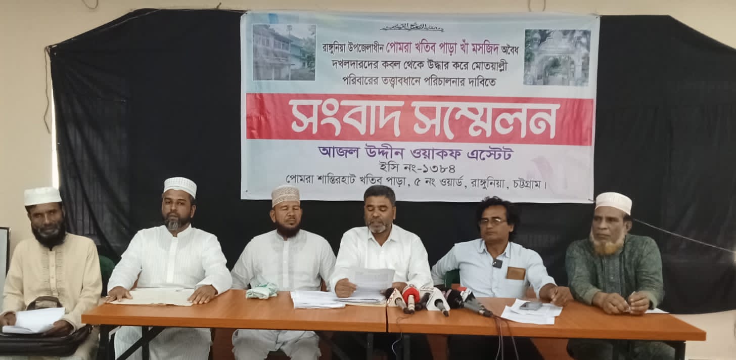 এ বিষয়টি নিয়ে জনমনে যাতে বিভ্রান্তির সৃষ্টি না হয় সে লক্ষে সংবাদ সম্মেলনের মাধ্যমে বিষয়টি তুলে ধরেছেন রাঙ্গুনিয়া উপজেলাধীন ৬নং পোমরা ইউনিয়নের খাঁ মসজিদের ব্যবস্থাপনায় মোতোয়াল্লী পরিবার ও স্থানীয় মুসল্লীরা।