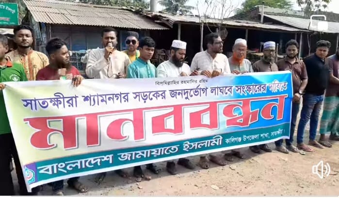 সাতক্ষীরা শ্যামনগর মহাসড়ক জনদুর্ভোগ লাঘবে সংস্কারের দাবিতে মানববন্ধন কর্মসূচি পালন করেছে বাংলাদেশ জামায়াতে ইসলামী কালিগঞ্জ শাখা ও যুব কমিটি সোমবার( ৪ নভেম্বর) বেলা ১১ টায় কালিগঞ্জ জামায়াত ইসলামীর আয়োজনে কালিগঞ্জ ফুলতলা মোড় রাস্তায়, রাস্তা সংস্কারের দাবিতে এই মানববন্ধন কর্মসূচি পালিত হয়। কালিগঞ্জ উপজেলা জামায়াত ইসলামের আমির মাওঃ আব্দুল ওহাব সিদ্দিকীর সভাপতিত্বে মানববন্ধন কর্মসূচিতে বক্তব্য রাখেন উপজেলা জামায়াতের সেক্রেটারি অধ্যাপক আব্দুর রউফ, সহকারী সেক্রেটারি আনারুল ইসলাম, সূরা সদস্য সালাউদ্দিন, সাবেক শিবির নেতা আজগর আলী, উপজেলা ছাত্রশিবিরের সভাপতি রবিউল ইসলাম, কালিগঞ্জ উপজেলা ছাত্র সমন্বয়ক আরিফুজ্জামান আরিফ ও আমির হামজা। মানববন্ধন কর্মসূচিতে বক্তারা বলেন জেলা সদরের সাথে যাতায়াতের একমাত্র সড়ক সাতক্ষীরা শ্যামনগর মহাসড়ক। কিন্তু বর্তমান এই সড়কটি চলাচলের অযোগ্য হয়ে পড়েছে। সমগ্র সড়ক জুড়ে বড় বড় খাদের সৃষ্টি হয়েছে যে কারণে সড়কে চলাচল অত্যন্ত ঝুঁকিপূর্ণ হয়ে পড়েছে। নিত্যদিন ছোটখাটো দুর্ঘটনা ঘটে চলেছে। তাই কালিগঞ্জের জনগণ যথাযথ কর্তৃপক্ষের দৃষ্টি আকর্ষণ করতে রাস্তায় নেমে মানববন্ধন করেছে। মহা সড়কটি যাতে ভগ্না দশা থেকে মুক্ত হয়ে আবারোও যান চলাচলের উপযুক্ত হতে পারে তার বিহিত ব্যবস্থা করতে বর্তমান তত্ত্বাবধায়ক সরকারের উপদেষ্টার হস্তক্ষেপ কামনা করেন ।পরে কালিগঞ্জ জামায়াতে ইসলামের নেতৃবৃন্দ উপজেলা নির্বাহী কর্মকর্তার মাধ্যমে সাতক্ষীরা জেলা প্রশাসক বরাবর স্মারকলিপি প্রদান করেন।