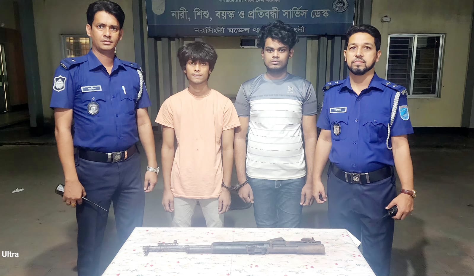 মোঃ কামাল হোসেন প্রধান জেলা প্রতিনিধি নরসিংদী ঃনরসিংদীতে এবার অত্যাধুনিক অস্ত্র চাইনিজ রাইফেল সহ দুই যুবককে গ্রেপ্তার করেছেন নরসিংদী মডেল থানা পুলিশ। আটককৃতরা হলেন, নরসিংদীর রায়পুরা উপজেলার হাঁটুভাঙা গ্রামের আফাজ উদ্দিনের ছেলে সাব্বির হোসেন (২০) ও রাজধানী ঢাকার দোহার থানার জয়পাড়া গ্রামের নাসির উদ্দীনের ছেলে আশিক মিয়া (২০)। নরসিংদী মডেল থানার অফিসার ইনচার্জ মোঃ এমদাদুল হক বলেন , জেলা পুলিশ সুপারের দিকনির্দেশনায় নরসিংদী জেলা থেকে সন্ত্রাস, চাঁদাবাজ, মাদক, অবৈধ অস্ত্র উদ্ধার সহ অপরাধীদের গ্রেপ্তার করতে জেলা পুলিশ নিয়মত কাজ করে যাচ্ছেন। এরই ধারাবাহিকতায় নরসিংদী মডেল থানা পুলিশ শহরের বিভিন্ন স্থানে নিয়মিত অভিযান পরিচালনা করে থাকেন। গত শনিবার বিকেল সাড়ে ৪টায় উপপরিদর্শক আজিজুল ইসলাম নাইমের নেতৃত্বে সহকারী উপপরিদর্শক জাকির হোসেন সহ সঙ্গীয় ফোর্সের সমন্বয়ে গঠিত একটি চৌকস দল গোপন সংবাদের ভিত্তিতে শহরের বীরপুর এলাকায় জাকির মিয়ার বাড়িতে অভিযান চালিয়ে সাব্বির ও আশিককে আটক করেন। প্রাথমিক জিজ্ঞেসাবাদে একপর্যায়ে আশিক স্বীকার করেন যে তাদের দখলে একটি চায়নিজ রাইফেল রয়েছে। পরে তার কথামত ৩ নভেম্বর দিবাগত রাতে জাকির মিয়ার বাড়িতে অভিযান চালিয়ে মাটির নিচে সাদা পলিথিনে মোড়ানো অবস্থায় একটি চায়নিজ রাইফেল উদ্ধার করা হয়।তিনি আরও জানান, সাব্বির ও আশিক ভিন্ন জেলার বাসিন্দা হলেও তারা দীর্ঘদিন ধরে জাকির মিয়ার বাড়িতে ভাড়াটিয়া হিসেবে সপরিবারে বসবাস করে আসছে। তাদের বিরুদ্ধে পূর্বে থানায় কোনো মামলা না থাকলেও তারা উঠতি বয়সের সন্ত্রাসী। আটককৃতদের বিরুদ্ধে পরস্পর জ্ঞাতসারে অবৈধ আগ্নেয়াস্ত্র নিজেদের দখলে রাখার অপরাধে অস্ত্র আইনে নিয়মিত মামলা রুজু করা হয়ছে বলেও তিনি জানান।