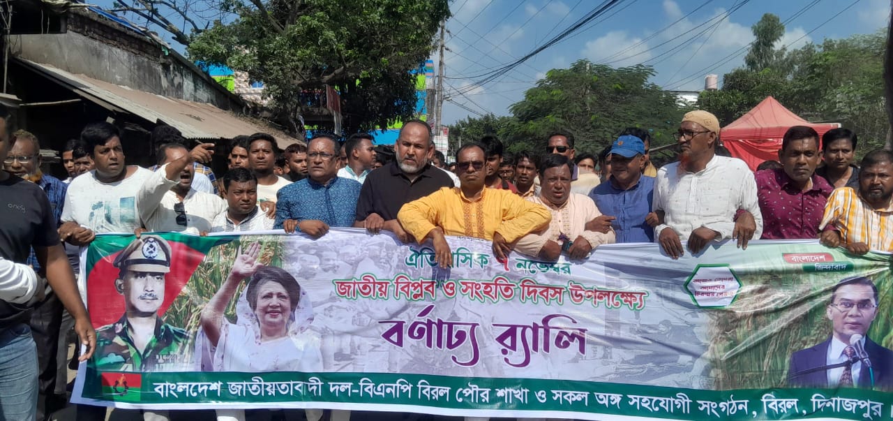 বিরলে ঐতিহাসিক ৭ নভেম্বর জাতীয় বিপ্লব ও সংহতি দিবস বিভিন্ন কর্মসূচির মধ্য দিয়ে উদযাপন করা হয়েছে। কর্মসূচির মধ্যে জাতীয় ও দলীয় পতাকা উত্তোলন, বর্ণাঢ্য র্যালি ও আলোচনা সভা অনুষ্ঠিত হয়।বৃহষ্পতিবার সকালে পৌরশহরের গুরুত্বপূর্ণ সড়কসমূহ প্রদক্ষিণ শেষে বিরল বাজার বকুলতলা মোড়ে বিরল পৌর বিএনপি’র সভাপতি মোঃ লিয়াকত আলী এর সভাপতিত্বে সাধারণ সম্পাদক নুর জামাল হোসেন (সোনাহার) এর সঞ্চালনায় আলোচনা সভায় প্রধান অতিথি’র বক্তব্য রাখেন জেলা বিএনপি’র সহসভাপতি মোজাহারুল ইসলাম এবং প্রধান বক্তার বক্তব্য রাখেন জেলা বিএনপি’র যুগ্ম সাধারণ সম্পাদক ও বিরল উপজেলা পরিষদের সাবেক চেয়ারম্যান আ ন ম বজলুর রশীদ কালু।