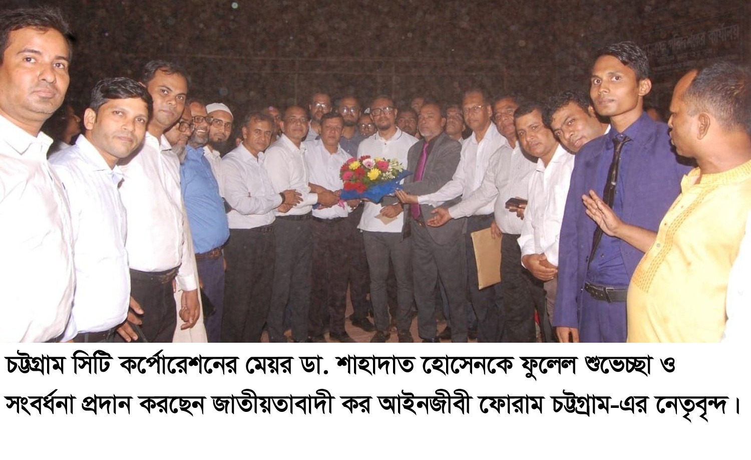 ১০ নভেম্বর ২০২৪ইং রাত ৮টায় নাসিমন ভবন বিএনপির দলীয় কার্যালয়ে চট্টগ্রাম সিটি কর্পোরেশনের নব নির্বাচিত মেয়র ডা. শাহাদাত হোসেনকে ফুলেল শুভেচ্ছা ও সংবর্ধনা জানান জাতীয়তাবাদী কর আইনজীবী ফোরাম চট্টগ্রাম-এর নেতৃবৃন্দ। এ সময় সভাপতিত্ব করেন জাতীয়তাবাদী কর আইনজীবী ফোরাম চট্টগ্রাম-এর সভাপতি আলহাজ্ব মোহাম্মদ মুছা। সঞ্চালনা করেন চট্টগ্রাম কর আইনজীবী সমিতির সাধারণ সম্পাদক ও ফোরামের নেতা বাকাউল্লাহ চৌধুরী ইরান। এই সময় সংবর্ধিত অতিথি নব নির্বাচিত মেয়র ডাক্তার শাহাদাত হোসেন কর আইনজীবীদেরকে নগরবাসীর পক্ষ থেকে ধন্যবাদ জানিয়ে বলেন, চট্টগ্রামের উন্নয়নের স্বার্থে কর আইনজীবীদের ভূমিকা যেন দৃষ্টান্ত হয়ে থাকে। কর আইনজীবীরা দেশের রাজস্ব আদায়ে গুরুত্বপূর্ণ ভূমিকা রাখেন। চট্টগ্রাম নগরীর উন্নয়নের কর আইনজীবীদের সহযোগিতা কামনা করছি। দেশে গণতন্ত্রকে প্রাতিষ্ঠানিক রূপ দেওয়ার জন্য একটি সুষ্ঠু ও নিরপেক্ষ নির্বাচন করা একান্ত প্রয়োজন।