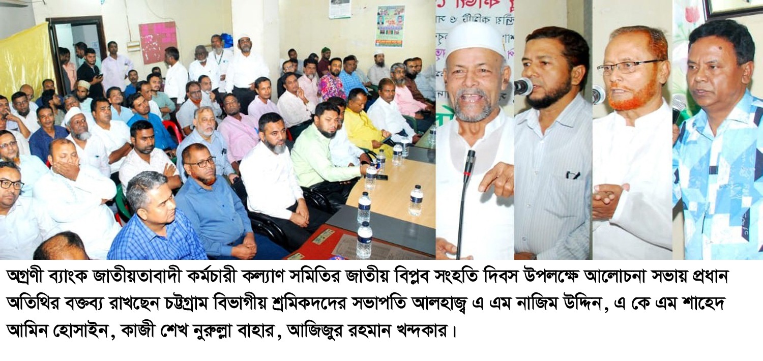 গতকাল ২০ নভেম্বর বুধবার সন্ধ্যা ৬টায় চট্টগ্রাম আগ্রাবাদ কাদেরী চেম্বারে অগ্রণী ব্যাংক জাতীয়তাবাদী কর্মচারী কল্যাণ সমিতির উদ্যোগে সংগঠনের কার্যালয়ে ৭ নভেম্বর জাতীয় বিপ্লব সংহতি দিবস উপলক্ষে আলোচনা সভায় বিএনপি কেন্দ্রীয় শ্রমিক সম্পাদক, শ্রমিকদল চট্টগ্রাম বিভাগীয় সভাপতি আলহাজ্ব এ এম নাজিম উদ্দিন প্রধান অতিথির বক্তব্যে বলেন, শ্রমিকেরা অধিকার বঞ্চিত হলে কোন প্রতিষ্ঠানের উন্নতি কখনো সম্ভব নয়। বর্তমানে প্রতিটি প্রতিষ্ঠানে স্বৈরাচারের দোসরেরা অবস্থান করছে। সেদিকে লক্ষ্য রেখে রাষ্ট্রায়াত্ব ব্যাংক, আর্থিক প্রতিষ্ঠানগুলো পরিচালিত করা উচিত এবং শ্রমজীবী মানুষের অধিকার আদায়ের জন্য মহান স্বাধীনতার ঘোষক শহীদ রাষ্ট্রপতি জিয়াউর রহমান দেশের স্বাধীনতার ঘোষণা করে ৭ নভেম্বর সিপাহী বিপ্লবে নিজের জীবনের ঝুঁকি নিয়ে যেই অবদান রেখেছেন, সিপাহী জনতা জিয়াউর রহমানকে সম্মাননা দিয়ে রাষ্ট্রীয় ক্ষমতায় প্রতিষ্ঠিত করেছিলেন। আজকে সেই মহান নেতার প্রতি গভীর শ্রদ্ধা জ্ঞাপন করছি এবং শহীদ জিয়াউর রহমান রাষ্ট্রীয় ক্ষমতায় থাকা অবস্থায় শ্রমিকদের অধিকার প্রতিষ্ঠার জন্য দল প্রতিষ্ঠা করার সময় যে ১৯ দফা কর্মসূচি দিয়েছেন, সেখানে শ্রমিকদের অধিকার নিয়ে কয়েকটি দাবি সংযোজন করেছেন। তিনি সর্বদায় মানুষের অধিকার প্রতিষ্ঠার কথা বিবেচনা করে রাষ্ট্র পরিচালিত করেছিলেন। তার শাসনামলে কখনো দুর্ভিক্ষ হয়নি ও দুঃশাসন ছিলনা। আইনের শাসন প্রতিষ্ঠিত হয়েছে ১ শিফট্-এর পরিবর্তে ৩ শিফট্ চালু করেছিলেন। তিনি মাটি ও মানুষের নেতা ছিলেন। অগ্রণী ব্যাংক জাতীয়তাবাদী কর্মচারী সমিতি চট্টগ্রাম অঞ্চলের সভাপতি মোঃ শাহাবুদ্দিনের সভাপতিত্বে সাধারণ সম্পাদক আজিজুর রহমান খন্দকার ও বকুল বড়ুয়া সঞ্চালনার দায়িত্ব পালন করেন।