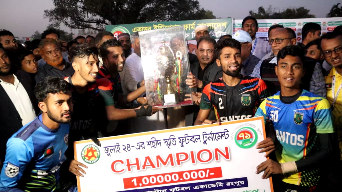 ঠাকুরগাঁওয়ে জুলাই-২৪ এর শহীদ স্মৃতি ফুটবল টুর্নামেন্টের ফাইনাল খেলায় বিজয়ীর মাঝে পুরস্কার বিতরণ করা হয়। ২২ নভেম্বর শুক্রবার সন্ধ্যায় ঠাকুরগাঁও সদর উপজেলার সালন্দর ইউনিয়নের চেরাডাঙ্গী মাঠে আয়োজিত এই খেলায় প্রধান অতিথি হিসেবে বিজয়ী দলের হাতে চ্যাম্পিয়ান ট্রফি তুলে দেন ঠাকুরগাঁও জেলা বিএনপির সাধারণ সম্পাদক মির্জা ফয়সল আমীন। এর আগে দুপুরে ফাইনাল খেলায় সেন্টোস কাব রংপুর ও নীলফামারীর ফুটবল একাডেমী দুটি দল অংশ নেয়। খেলায় ৩ - ০ গোলে নীলফামারীকে হারিয়ে জয়ী হয় রংপুর দল। খেলা শেষে চ্যাম্পিয়ন ও রানার্স অ্যাপ দলের মাঝে ট্রফি বিতরণ করা হয়। এ সময় ঠাকুরগাঁও জেলা বিএনপির সাধারণ সম্পাদকের সহধর্মীনী জান্নাতুল ফেরদৌস, ঠাকুরগাঁও সদর উপজেলা বিএনপির সভাপতি আব্দুল হামিদ, পৌর বিএনপির সভাপতি শরিফুল ইসলাম শরিফ, ছাত্রদলের সভাপতি কায়েস, ইউনিয়ন বিএনপির সভাপতি গোলাম মাওলা চৌধুরী, সাধারণ সম্পাদক নজরুল ইসলাম, ইউনিয়ন বিএনপির যুবদল, ছাত্রদল ,সহ স্থানীয় বিএনপির নেতৃবৃন্দরা উপস্থিত ছিলেন।
