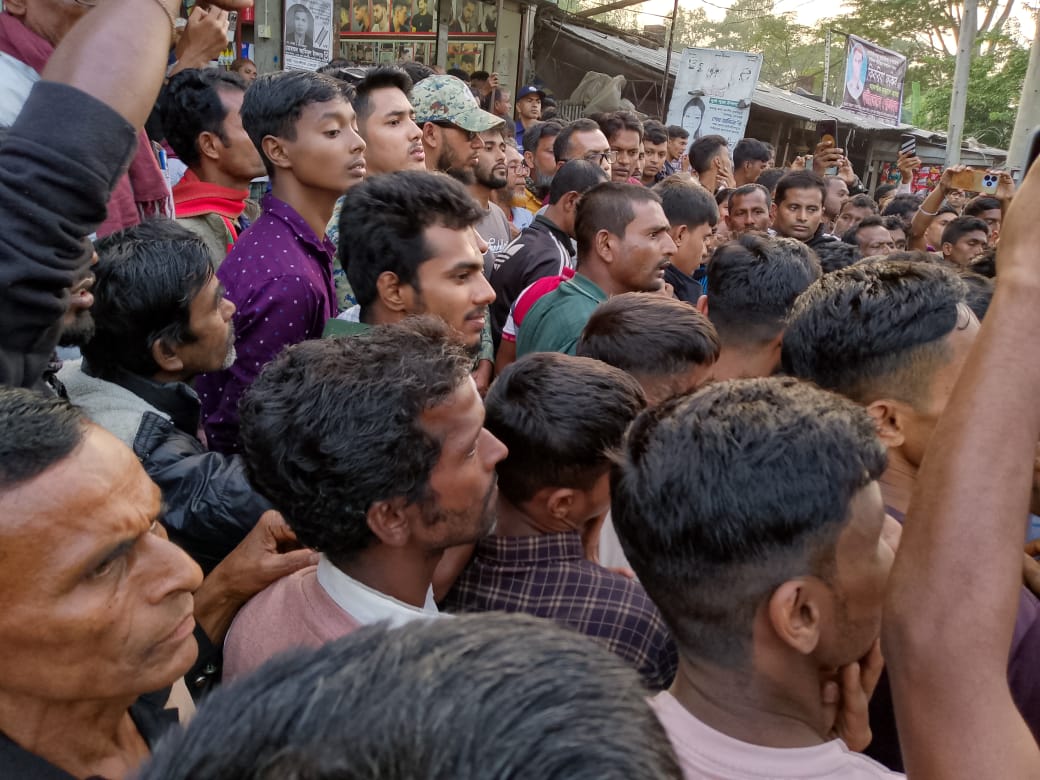 এ সময় উপজেলার বিভিন্ন ইউনিয়ন থেকে সনাতন ধর্মাবলম্বী শত-শত নারী পুরুষ টি টি স্কুল মাঠে জড়ো হয়ে বিক্ষোভ সমাবেশ শুরু করে। বিক্ষোভ মিছিলটি ভাঙ্গার হাট প্রধান প্রধান সড়ক প্রদক্ষিন করে ভাঙ্গার হাট বাজারের মাহেন্দ্র স্টান্ডে এসে প্রতিবাদ সমাবেশ করে বিভিন্ন স্লোগান দিতে থাকে।