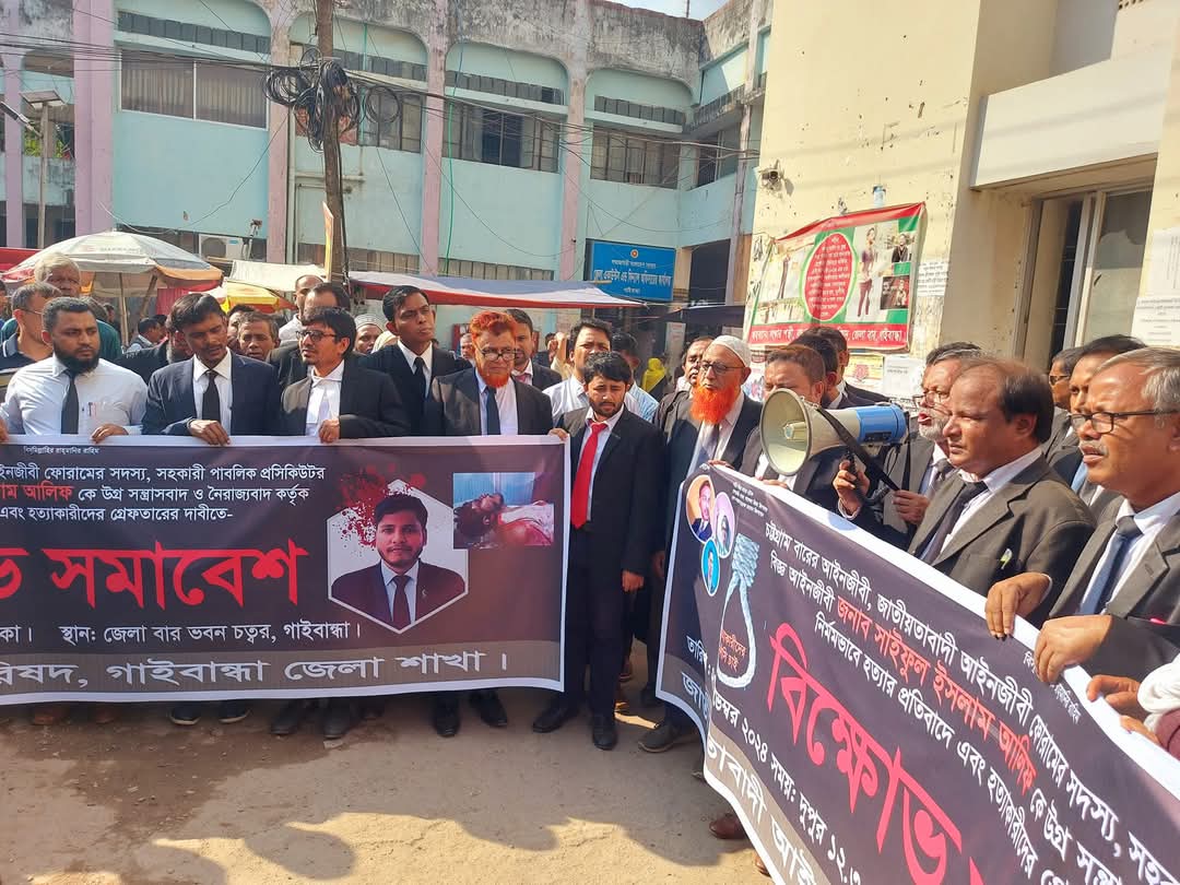 চট্টগ্রামে সম্মিলিত সনাতনী জাগরণ জোটের মুখপাত্র চিন্ময় কৃষ্ণ দাস ব্রহ্মচারীর অনুসারীদের সংঘর্ষের সময় আইনজীবীকে হত্যার প্রতিবাদে বিক্ষোভ সমাবেশ করেছেন গাইবান্ধার আইনজীবীরা। ২৭ নভেম্বর বুধবার গাইবান্ধা আইনজীবী ঐক্য পরিষদ ও জাতীয়তাবাদী আইনজীবী ফোরামের যৌথ উদ্যোগে জেলা আইনজীবী সমিতির সামনে বিক্ষোভ সমাবেশ করেন আইনজীবীরা।