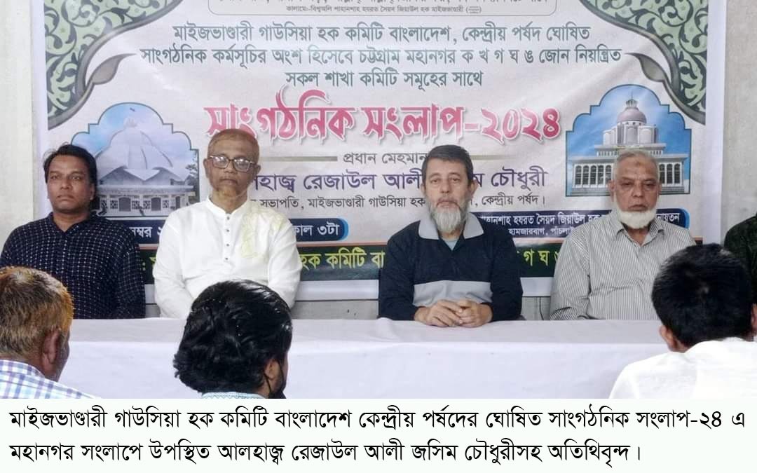 হামজারবাগ মাদ্রাসা ই শাহানশাহ হযরত সৈয়দ জিয়াউল হক মাইজভাণ্ডারী (ক.) মিলায়তনে চট্টগ্রাম মহানগর ক জোনের ব্যবস্থাপনায় মাইজভাণ্ডারী গাউসিয়া হক কমিটি বাংলাদেশ কেন্দ্রীয় পর্ষদের ঘোষিত সাংগঠনিক সংলাপ-২৪ গত ২ ডিসেম্বর সোমবার বিকাল ৪ ঘটিকার সময় অনুষ্ঠিত হয়।