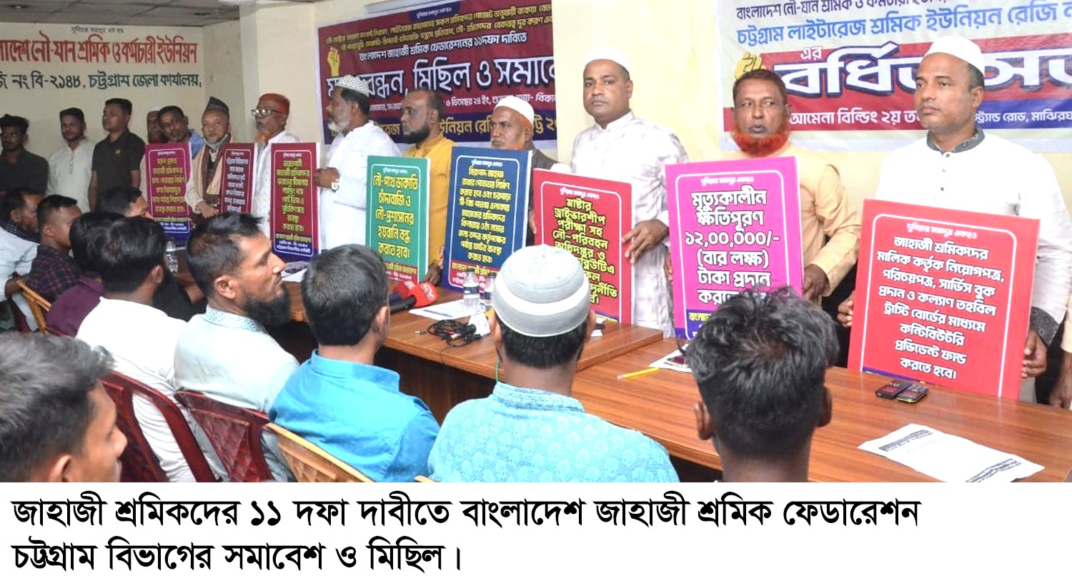 তিনি বলেন, মালিক পক্ষের কিছু কুচক্রী মহলের যোগসাজশে ও সরকারের কতিপয় দুর্নীতিবাজ কর্মকর্তাদের কারণে ১১ দাবি বাস্তবায়ন হচ্ছে না। ফেডারেশনের আওতাভুক্ত বাংলাদেশ নৌ-যান শ্রমিক ও কর্মচারী ইউনিয়ন রেজি. নং- বি-২১৪৮ চট্টগ্রাম জেলা শাখা, চট্টগ্রাম লাইটারেজ শ্রমিক ইউনিয়ন রেজি. নং- চট্ট-২০৯০ সহ বিভিন্ন বেসিক ইউনিয়নের নেতৃবৃন্দের সমন্বয়ে উক্ত সমাবেশে উত্থাপিত হওয়া ১১ দফা সমূহ হল- ১. জাহাজী শ্রমিকদের মালিক কর্তৃক নিয়োগ পত্র, পরিচয় পত্র, সার্ভিস বুক প্রদান ও কল্যাণ তহবিল ট্রাস্টি বোর্ডের মাধ্যমে কন্টিবিউটরি প্রভিডেন্ট ফান্ড গঠন করতে হবে। ২. গত ৩০ মার্চ ২০২৩ইং এর গেজেট অনুযায়ী বকেয়া পাওনা সহ বেতন পরিশোধ করতে হবে। ৩. মৃত্যুকালীন ক্ষতিপূরণ ১২ লক্ষ টাকা প্রদান করতে হবে। ৪. ভারতগামী জাহাজী শ্রমিকদের ভারতের সীমানার ল্যান্ডিং পাস, পোর্ট ভিসা ও সুচিকিৎসা ব্যবস্থা করতে হবে। ৫. বালুবাহী বাল্কহেড শ্রমিকদের উপর নৌ-প্রশাসনের হয়রানী, মিথ্যা মামলা বন্ধ করতে হবে। ৬. নৌ-পথে ডাকাতি, চাঁদাবাজি ও নৌ-প্রশাসনের হয়রানি বন্ধ করতে হবে। ৭. নিরাপদে জাহাজ রাখার পোতশ্রয় নির্মান করতে হবে এবং চরপাড়া সী-বিচ পতেঙ্গা এলাকায় জাহাজের কিনারায় উঠানামার জন্য বন্দর কর্তৃপক্ষের পর্যাপ্ত ঘাটের ব্যবস্থা করতে হবে। ৮. মাস্টার, ড্রাইভারশীস পরীক্ষা সহ নৌ-পরিবহন অধিদপ্তর ও বিআইডব্লিউটিএ এর সকল অনিয়ম ও দুর্নীতি বন্ধ করতে হবে। ৯. চট্টগ্রামে সিরিয়ালের নামে জাহাজ মালিকদের সৃষ্ট সমস্যা সংকট তাদের নিজেদের ব্যাপার, যা জাহাজ মালিকদেরই সমাধান করতে হবে। ১০. সকল প্রকার জাহাজী শ্রকিকদের জন্য পোতশ্রয় নির্মাণ করে ইজারামুক্তভাবে পর্যাপ্ত নিরাপত্তার ব্যবস্থা করতে হবে। ১১. বাংলাদেশ জাহাজী শ্রমিক ফেডারেশনের পক্ষ থেকে পেশকৃত ১১ দফার অমিমাংসিত দাবি দ্রুত বাস্তবায়ন করতে হবে। উক্ত সমাবেশে প্রধান বক্তা হিসেবে বক্তব্য রাখেন বাংলাদেশ জাহাজী শ্রমিক ফেডারেশন চট্টগ্রাম বিভাগের সাধারণ সম্পাদক মো. হাবিবুর রহমান মাস্টার।