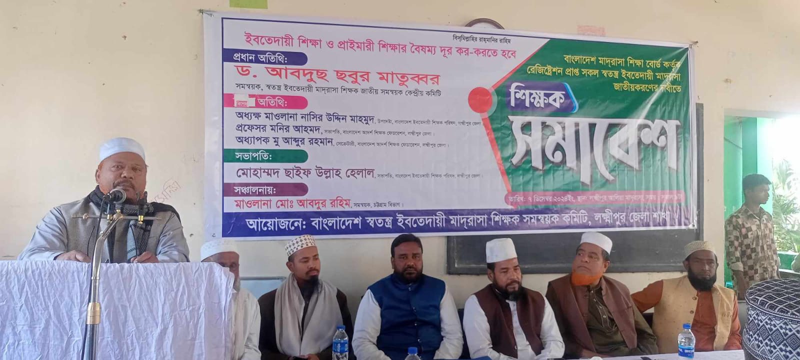 লক্ষ্মীপুরে স্বতন্ত্র ইবতেদায়ী মাদ্রাসা সরকারি প্রাথমিক বিদ্যালয়ের ন্যায় জাতীয় করণের দাবিতে শিক্ষক সমাবেশ অনুষ্ঠিত হয়েছে।