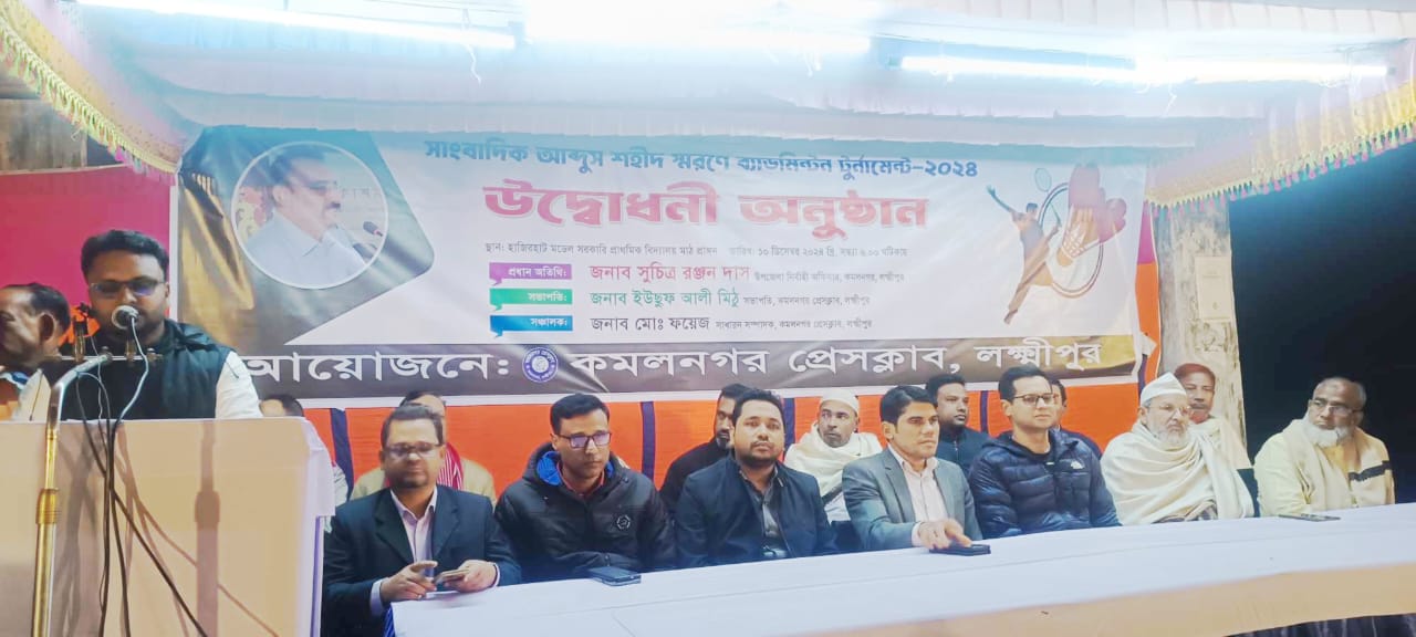 মোঃ নুর হোসেন,কমলনগর(লক্ষ্মীপুর) প্রতিনিধি:লক্ষ্মীপুরের কমলনগরে এনটিভির সাবেক বার্তা সম্পাদক সাংবাদিক আব্দুস শহিদ স্মরণে ব্যাডমিন্টন টুর্নামেন্টের উদ্বোধন করা হয়েছে। মঙ্গলবার সন্ধ্যায় প্রেসক্লাবের আয়োজনে হাজিরহাট মডেল সরকারি প্রাথমিক বিদ্যালয় মাঠে এ টুর্নামেন্টের উদ্বোধন করা হয়। প্রেসক্লাবের সভাপতি ইউছুফ আলী মিঠু'র সভাপতিত্বে এতে প্রধান অতিথি ছিলেন কমলনগর উপজেলা নির্বাহী কর্মকর্তা সুচিত্র রঞ্জন দাস। বিশেষ অতিথি ছিলেন সহকারী পুলিশ সুপার (রামগতি সার্কেল) রকিবুল হাসান, কমলনগর থানার ভারপ্রাপ্ত কর্মকর্তা তৌহিদুল ইসলাম ও সাব- রেজিস্ট্রার মোরশেদ আলম। প্রেসক্লাবের সাধারণ সম্পাদক মো.ফয়েজের সঞ্চালনায় আরো উপস্থিত ছিলেন, হাজির হাট উপকূল কলেজ সাবেক অধ্যক্ষ ও জেএসডি'র উপজেলা সভাপতি আবদুল মোতালেব, কমলনগর উপজেলা বিএনপি আহবায়ক আলহাজ্ব গোলাম কাদের, জেলা ফুটবল এসোসিয়েশনের সদস্য ও রামগতি উপজেলা সদস্য সচিব দিদার খন্দকার, হাজির হাট মিল্লাত একাডেমির প্রধান শিক্ষক মো: সাখায়েত হোসেন, প্রেস ক্লাব উপদেষ্টা কাজী মো: ইউনুস, শাইফুল্লাহ হেলাল,সিনিয়র সহ সভাপতি সানা উল্ল্যাহ, পল্লী নিউজ সম্পাদক ওয়াজি উল্ল্যাহ ও রিপোর্টার্স ক্লাব সভাপতি ইসমাইল হোসাইন বিপ্লবসহ কমলনগর উপজেলা প্রশাসনের বিভিন্ন দপ্তরের প্রধান, রাজনৈতিক, সামাজিক ও কর্মরত সকল সাংবাদিক বৃন্দ।