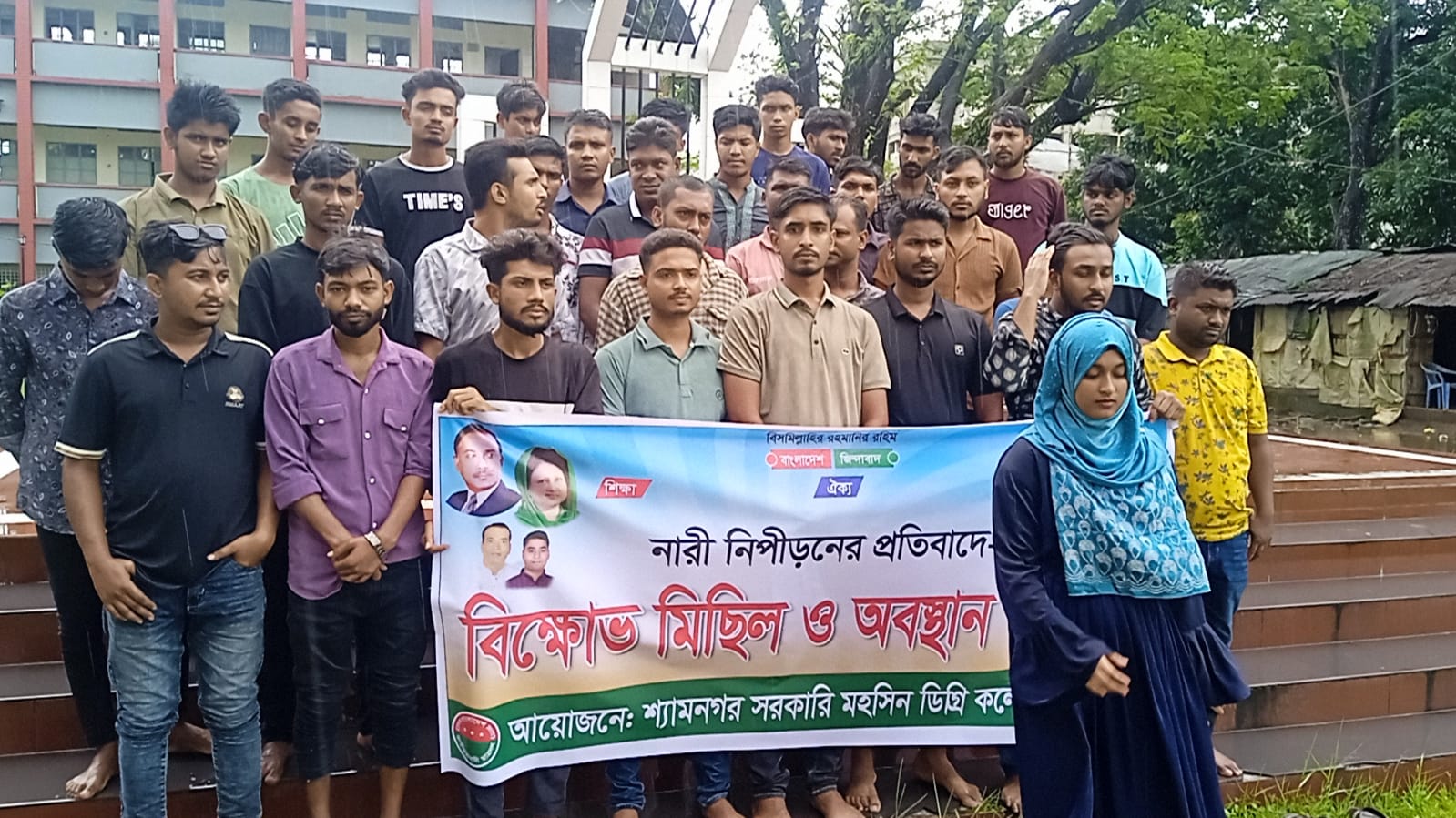 নারী শিক্ষার্থীকে শিবির নেতা কর্তৃক প্রকাশ্যে গণধর্ষণের হুমকি, রাজশাহী বিশ্ববিদ্যালয়ে ছাত্রদল নেত্রীদের হেনস্থা এবং শিবিরের নেতাকর্মীদের দ্বারা সারাদেশে নারী শিক্ষার্থীদের লক্ষ্য করে অব্যাহত সাইবার বুলিংয়ের প্রতিবাদে শ্যামনগর সরকারি মহসিন কলেজ ছাত্রদল বিক্ষোভ ও অবস্থান কর্মসূচী পালন করেছে।মঙ্গলবার (২ সেপ্টেম্বর) এ কর্মসূচীতে কলেজ ক্যাম্পাসে সমবেত হয়ে নেতাকর্মীরা প্রতিবাদ জানান। তারা বলেন, নারী শিক্ষার্থীদের উপর এ ধরনের হুমকি ও অপমানজনক আচরণ সামগ্রিকভাবে নারীর নিরাপত্তাকে হুমকির মুখে ফেলছে। শিবিরের এই ঘৃণ্য কর্মকাণ্ডের বিরুদ্ধে ছাত্রদল কঠোর অবস্থান নিতে বাধ্য হবে।কর্মসূচীতে উপস্থিত ছিলেন সংগঠনের সভাপতি ইয়াসিন আরাফাত, সিনিয়র সহ-সভাপতি ফারজানা সুলতানা লাকী, সহ-সভাপতি আব্দুল আল মামুন, আবু সাঈদ ও তামিম হাসান। সাধারণ সম্পাদক ছিলেন মাসুদ পারভেজ টোকন।এছাড়া যুগ্ম সাধারণ সম্পাদক মাসুদ পারভেজ (সদর), সামিউল ইসলাম সামি, ইয়াসিন আরাফাত রোহান, সাংগঠনিক সম্পাদক মোস্তাহিদ আহমেদ আকাশ, সহ-সাংগঠনিক সম্পাদক আশেক এলাহী মুন্না ও জান্নাতুল নাঈম আলিফ, প্রচার সম্পাদক মেহেদী হাসান সোনা, সাহিত্য ও প্রকাশনা সম্পাদক তানিয়া পারভীন এবং ছাত্রী বিষয়ক সম্পাদক জান্নাতুল ফেরদৌস মীমসহ অন্যান্য নেতৃবৃন্দও বক্তব্য রাখেন।বক্তারা দ্রুত দোষীদের বিরুদ্ধে ব্যবস্থা গ্রহণের দাবি জানান এবং নারী শিক্ষার্থীদের নিরাপত্তা নিশ্চিত না হওয়া পর্যন্ত আন্দোলন চালিয়ে যাওয়ার ঘোষণা দেন।