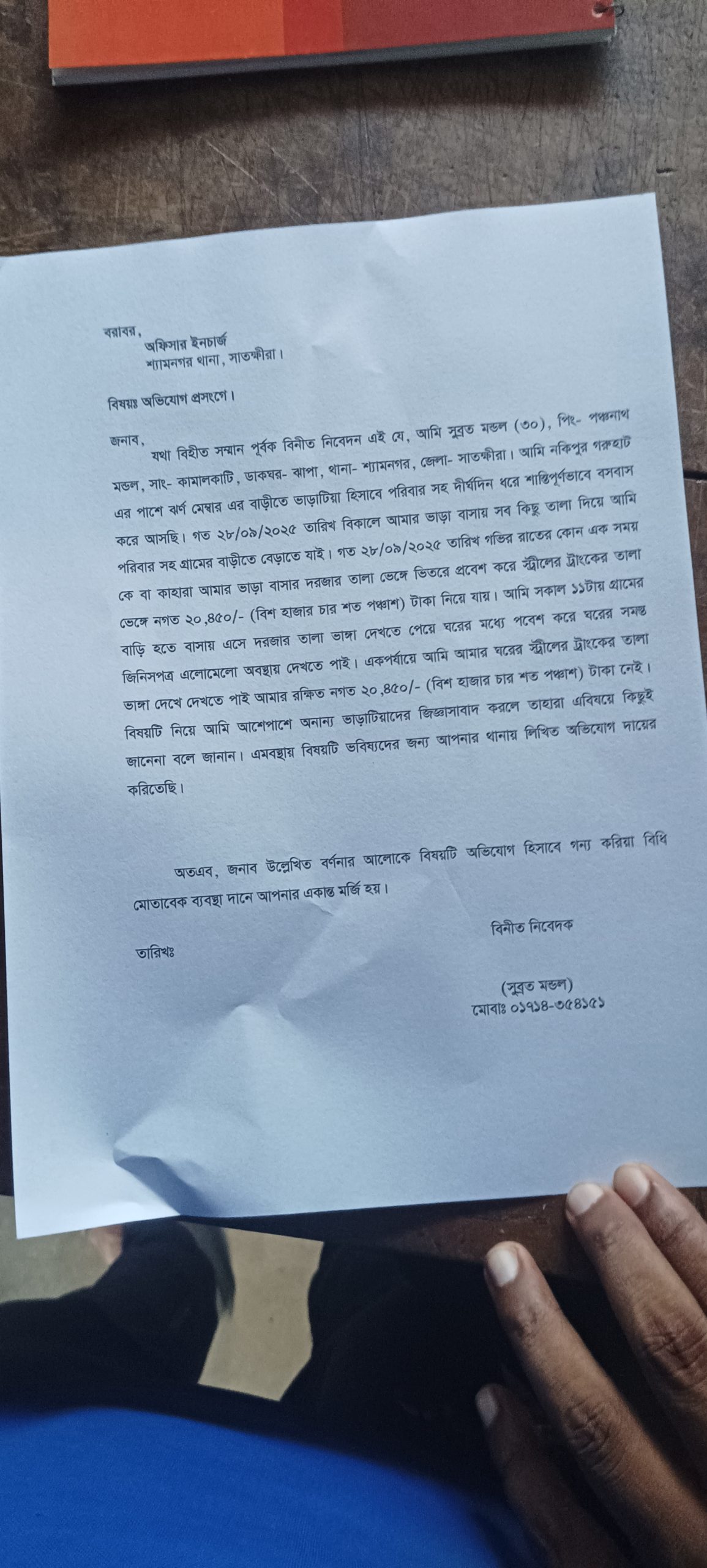 সুব্রত মন্ডল বলেন আমি নকিপুর গরুহাট এর পাশে ঝর্ণ মেম্বার এর বাড়ীতে ভাড়াটিয়া হিসাবে পরিবার সহ দীর্ঘদিন ধরে শান্তিপূর্ণভাবে বসবাস করে আসছি। গত ২৮/০৯/২০২৫ তারিখ বিকালে আমার ভাড়া বাসায় সব কিছু তালা দিয়ে আমি পরিবার সহ গ্রামের বাড়ীতে বেড়াতে যাই। গত ২৮/০৯/২০২৫ তারিখ গভির রাতের কোন এক সময় কে বা কাহারা আমার ভাড়া বাসার দরজার তালা ভেঙ্গে ভিতরে প্রবেশ করে স্ট্রীলের ট্রাংকের তালা ভেঙ্গে নগত ২০,৪৫০/- (বিশ হাজার চার শত পঞ্চাশ) টাকা নিয়ে যায়। আমি সকাল ১১টায় গ্রামের বাড়ি হতে বাসায় এসে দরজার তালা ভাঙ্গা দেখতে পেয়ে ঘরের মধ্যে পবেশ করে ঘরের সমস্ত জিনিসপত্র এলোমেলো অবস্থায় দেখতে পাই। একপর্যায়ে আমি আমার ঘরের স্ট্রীলের ট্রাংকের তালা ভাঙ্গা দেখে দেখতে পাই আমার রক্ষিত নগত ২০,৪৫০/- (বিশ হাজার চার শত পঞ্চাশ) টাকা নেই। বিষয়টি নিয়ে আমি আশেপাশে অনান্য ভাড়াটিয়াদের জিজ্ঞাসাবাদ করলে তাহারা এবিষয়ে কিছুই জানেনা বলে জানান। এমবস্থায় বিষয়টি ভবিষ্যদের জন্য আপনার থানায় লিখিত অভিযোগ দায়ের করিতেছি। এ বিষয়ে শ্যামনগর থানার ওসি হুমায়ুন মোল্লা জানান অভিযোগ হাতে পেয়েছি বিষয়টি তদন্ত করা হবে