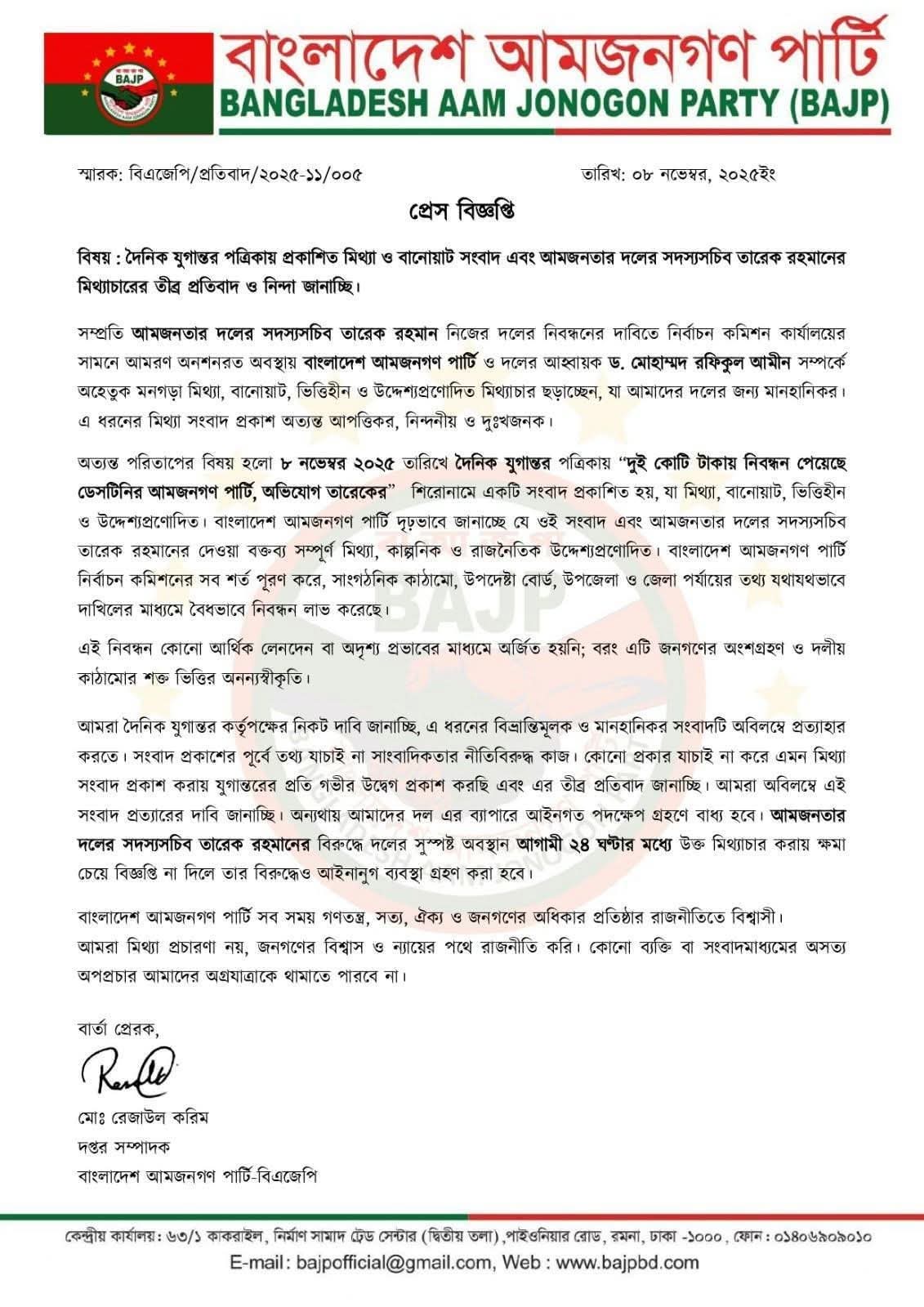 অত্যন্ত পরিতাপের বিষয় হলো ৮ নভেম্বর ২০২৫ তারিখে দৈনিক যুগান্তর পত্রিকায় “দুই কোটি টাকায় নিবন্ধন পেয়েছে ডেসটিনির আমজনগণ পার্টি, অভিযোগ তারেকের” শিরোনামে একটি সংবাদ প্রকাশিত হয়, যা মিথ্যা, বানোয়াট, ভিত্তিহীন ও উদ্দেশ্যপ্রণোদিত।