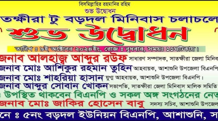 নিজস্ব সংবাদদাতা সাতক্ষীরা, সাতক্ষীরা জেলার আশাশুনি উপজেলার বড়দল হাট থেকে আগামী কাল বাস চলাচল শুভ উদ্বোধন করা হবে। বড়দল ভায়া আশাশুনি টু সাতক্ষীরা এসে পৌঁছাবে বাস। এতে বড়দল বাসীর
