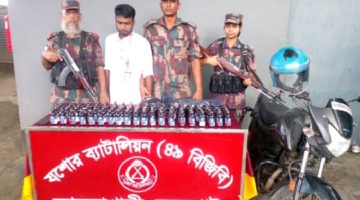 মনির হোসেন, প্রতিনিধি:- যশোরের শার্শায় সীমান্তে অভিযান চালিয়ে ১০০ বোতল ফেন্সিডিলসহ শেখ মফিজুর রহমান (২৯) নামে এক ছাত্রলীগ নেতাকে আটক করেছে ৪৯ বর্ডার গার্ড বাংলাদেশ (বিজিবি) সদস্যরা। সে