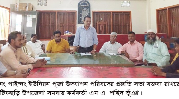 রিপোর্ট: স ম জিয়াউর রহমান পাইন্দং ইউনিয়ন পূজা উদযাপন পরিষদের উদ্যোগে আসন্ন দূর্গা পূজায় আইনশৃঙ্খলা ও সার্বিক নিরাপত্তা নিয়ে প্রস্তুতি সভা গত ৩ অক্টোবর অনুষ্ঠিত হয়। উক্ত সভায় প্রধান