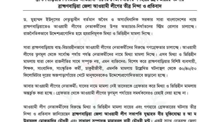 স ম জিয়াউর রহমান : ড. মুহাম্মদ ইউনূসের নেতৃত্বাধীন বর্তমান অবৈধ ও অসাংবিধানিক সরকার সারা বাংলাদেশের ন্যায় ব্রাহ্মণবাড়িয়াতেও আওয়ামী লীগের নেতাকর্মীদের উপর অত্যাচার-নির্যাতনের স্টিম রোলার চালাচ্ছে। রাজনৈতিকভাবে