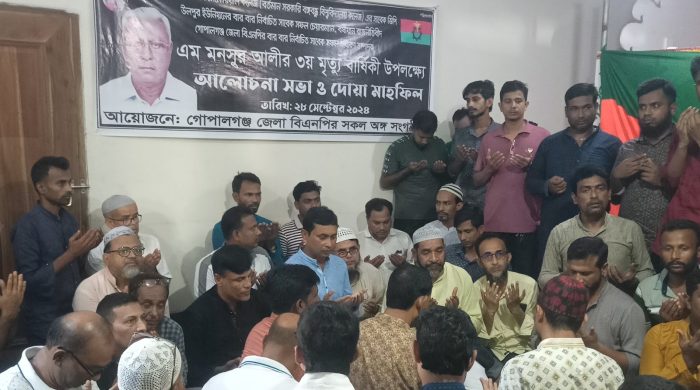 মোঃ শিহাব উদ্দিন গোপালগঞ্জ। গোপালগঞ্জে৷ সাবেক জেলা বিএনপির সাধারণ সম্পাদক এম মনসুর আলী তৃতীয় মৃত্যু বার্ষিকী উপলক্ষ্যে আলোচনা সভা, দোয়া ও মিলাদ মহফিল অনুষ্ঠিত হয়েছে। জেলা বিএনপির