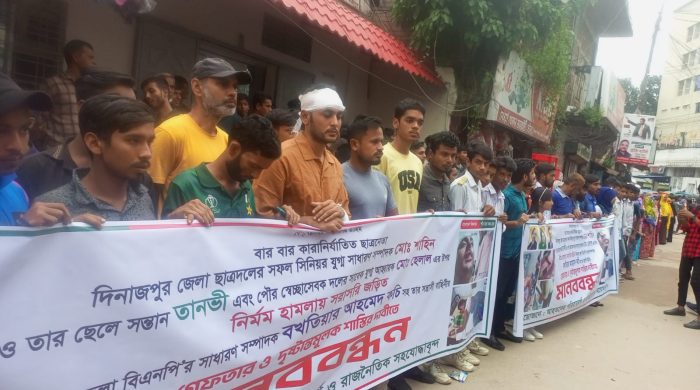 মো:মেহেদী হাসান ফুয়াদ দিনাজপুর জেলা প্রতিনিধি দিনাজপুর জেলা বিএনপির সাধারণ সম্পাদক বখতিয়ার আহমেদ কচি ও তার সন্ত্রাসী বাহিনীর হামলার প্রতিবাদে মানববন্ধন করেছে আহতদের পরিবার ও বিএনপির
