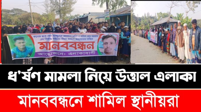মোঃ নুর হোসেন,কমলনগর প্রতিনিধিঃ লক্ষ্মীপুরের কমলনগরে ধর্ষণের মিথ্যা মামলায় কলেজ ছাত্র মো.মাকছুদুর রহমান রনি ও শ্রমিক মো.আশরাফকে কারাগারে পাঠানোর প্রতিবাদে মানববন্ধন করেছেন এলাকাবাসী। শনিবার বিকেলে উপজেলার চর কাদিরার ইউনিয়নের