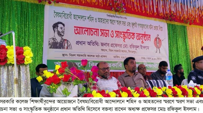 সাদেকুল ইসলাম, বিরল(দিনাজপুর)প্রতিনিধি: বিরল সরকারি কলেজ শিক্ষার্থীবৃন্দের আয়োজনে বৈষম্যবিরোধী আন্দোলনে শহিদ ও আহতদের স্মরণে স্মরণ সভা এবং জুলাই গণঅভ্যূত্থানের ঘটনা প্রবাহ নিয়ে আলোচনা সভা ও সাংস্কৃতিক অনুষ্ঠান